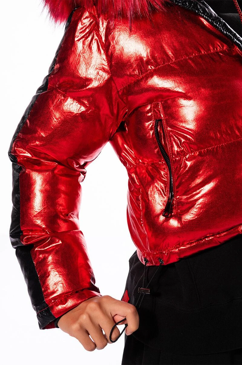 Superstar status! Hit the road in The AKIRA Label AKIRA Tour Metallic Puffer Coat. This shimmering metallic puffer features long sleeves, striped accents, side zipper pockets, a zip front closure, and detachable fur trim hood with pop button clasps. Complete with dual adjustable drawstring waist toggles for a secure fit. Pair with a sleek bodysuit and relaxed fit joggers for a complete look.