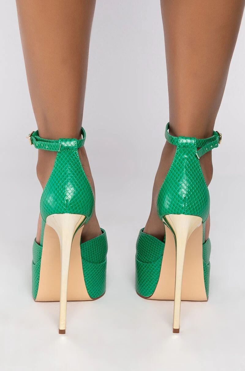 The AZALEA WANG Catch Flights Not Feelings Stiletto Sandal In Green features a snake-embossed faux leather upper and footband, an open square toe design, a platform sole, and a towering metallic stiletto heel. Complete with a buckle fastening.