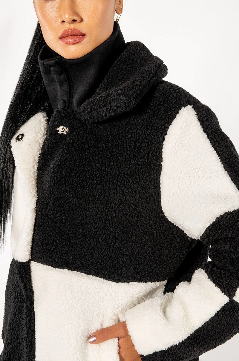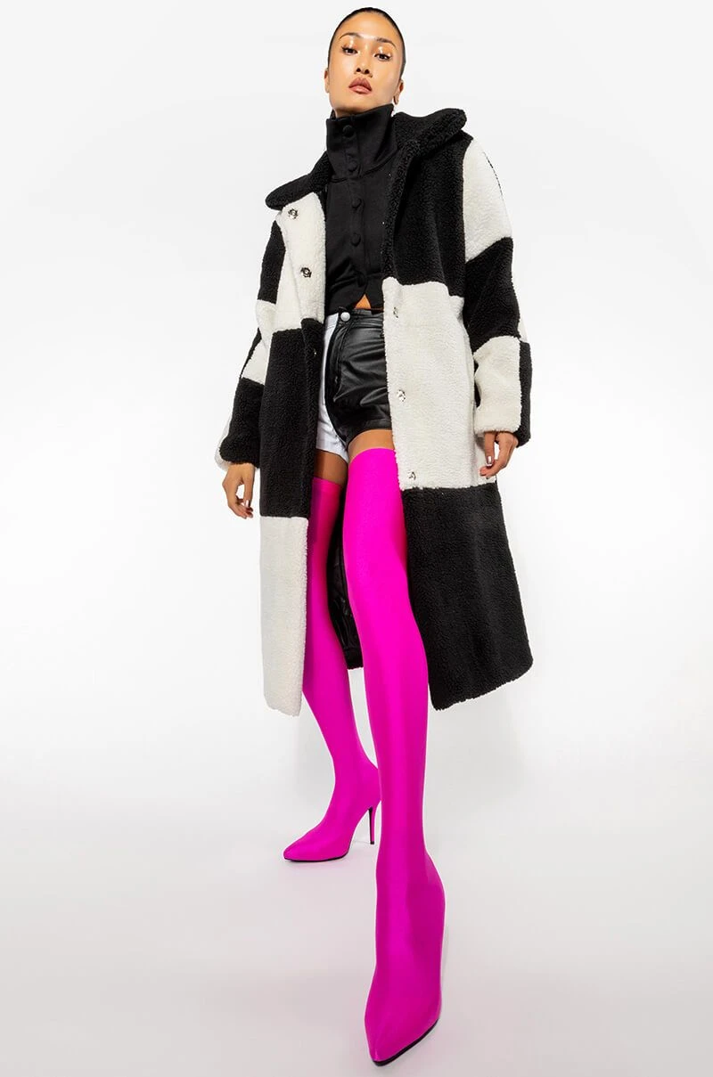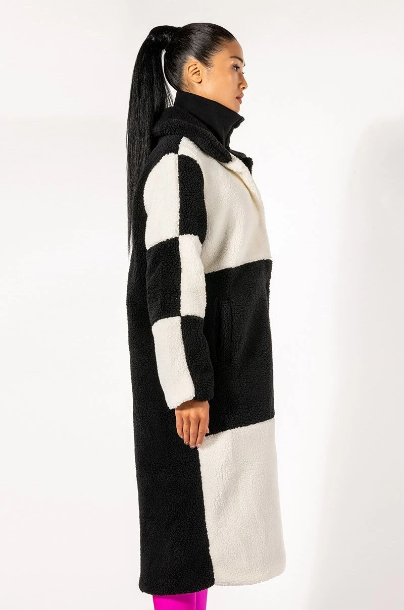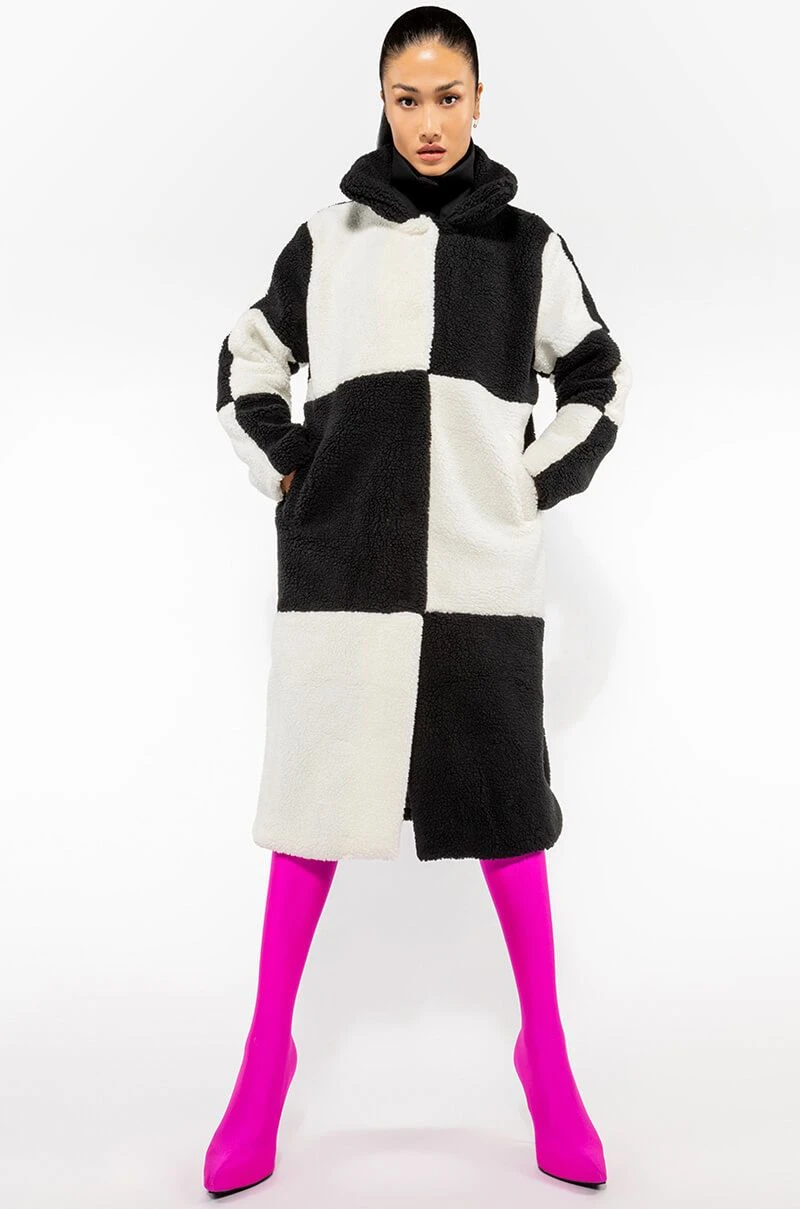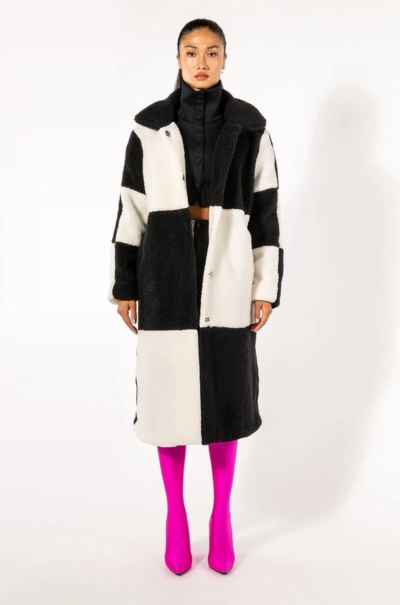 Peep this! The AZALEA WANG Check It Long Teddy Trench features a nubby teddy fabrication, a fold over collar, a concealed pop button front placket, check print patterning, slant side pockets, long sleeves, and a luxe satin inner lining. Complete with a duster length silhouette. Style with white booties for a mod look.