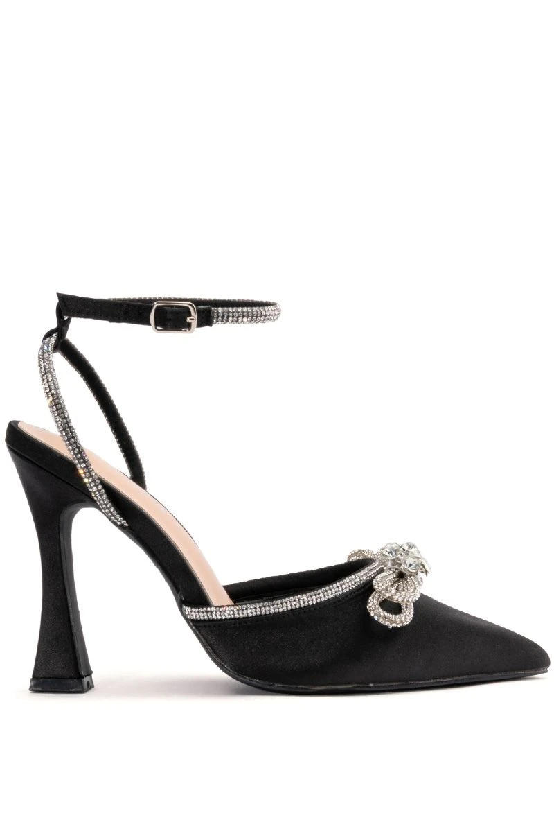 The AZALEA WANG Lover Girl Rhinestone Bow Embellished Stiletto Pump in Black features a shiny satin upper, a pointed toe, a flared stiletto heel, rhinestone-embellished wrap-around ankle straps, rhinestone trim detailing, and a rhinestone bow accent. Complete with a silver metallic buckle ankle fastening and a cushioned midsole. Style with a sexy satin mini dress for a sparkly night out.