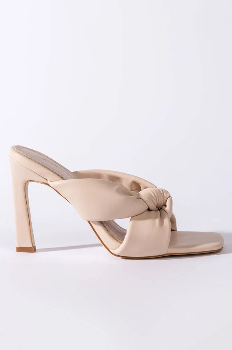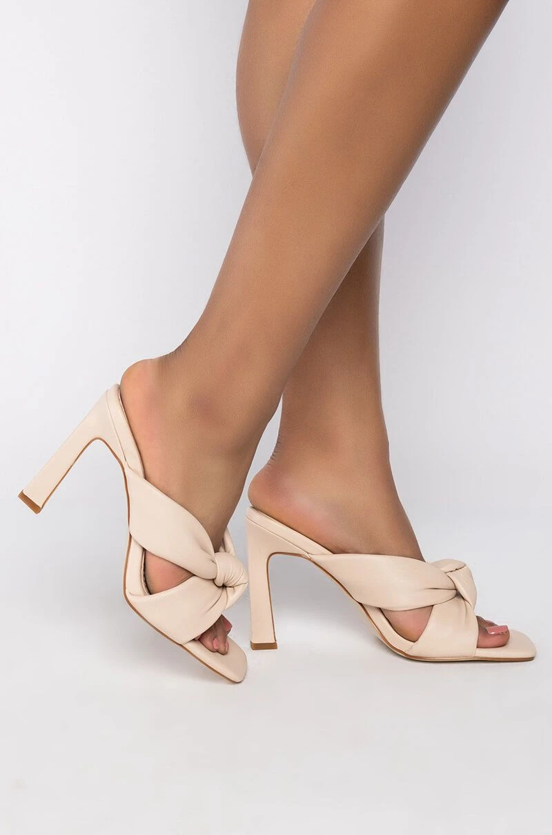 The AZALEA WANG Sweet Like Sunday Chunky Sandal In Bone features a soft faux leather fabrication, knotted front straps, a mule silhouette, square open toe shape, step-in fit, and a chunky heel.