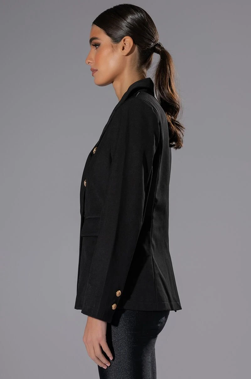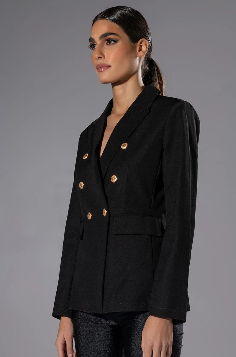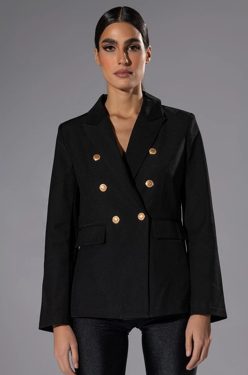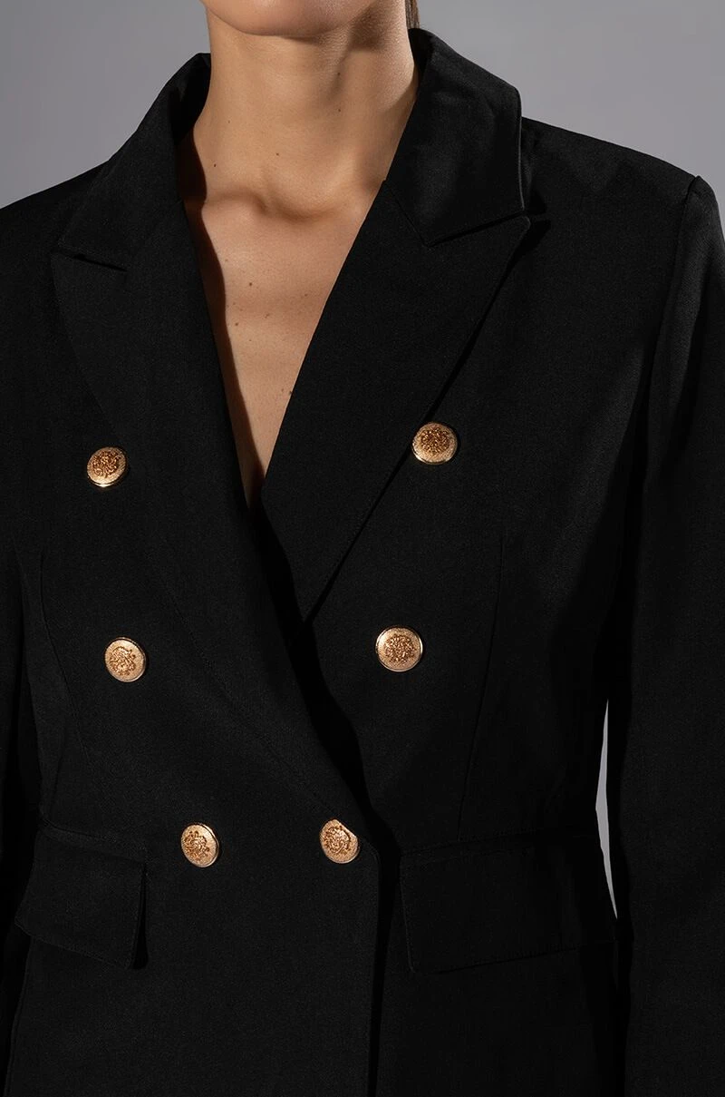 Simple yet elegant. The AKIRA Label Back To Basics Dressy Blazer is a double breasted longline blazer featuring a classic smooth woven fabrication, a notched lapel collar, faux gold metallic buttons, long sleeves, and flap front pockets. Complete with a satin inner lining, plunging neckline, and single pop button font closure. Pair this piece with slim trousers to finish off your tailored look.