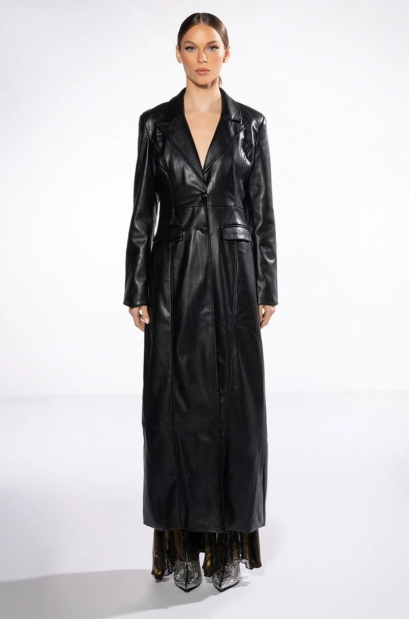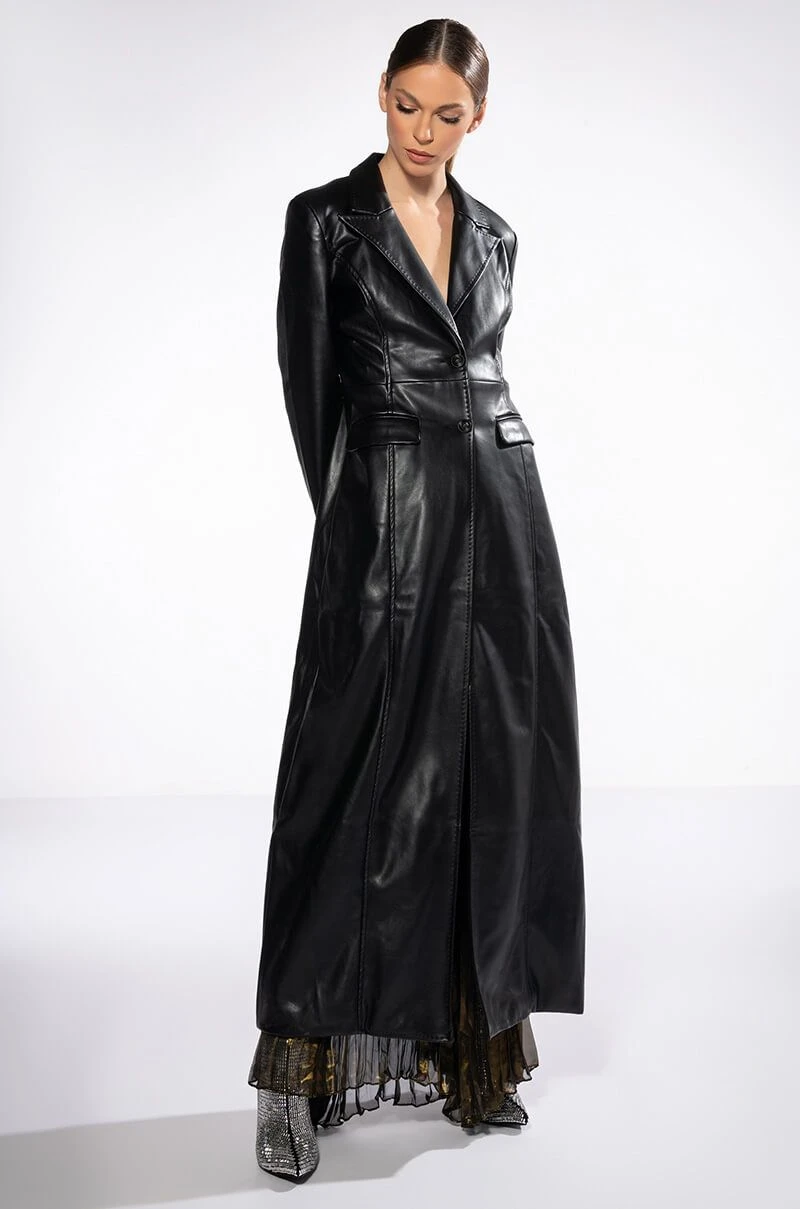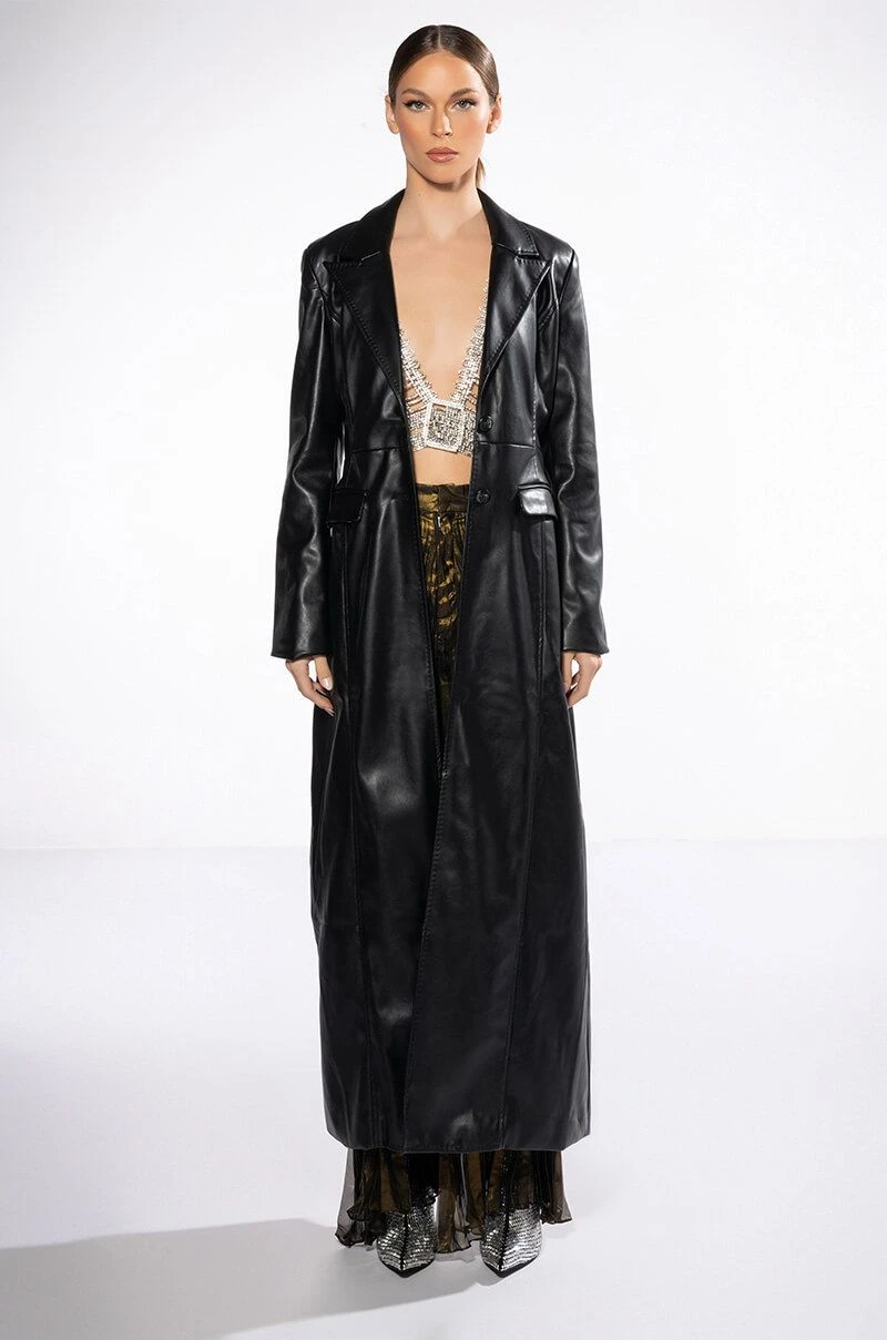 The AKIRA Label Beyond Classic Long PU Trench With Cheetah Lining is made from a smooth vegan leather fabrication and features padded shoulders, a wide notch lapel collar with baste stitching, long sleeves with ornate crown-embossed metal buttons, lined front flap pockets, elongating princess seam detailing, satiny cheetah print lining, and a maxi-length silhouette. Complete with ornate crown-embossed metal button front closures.