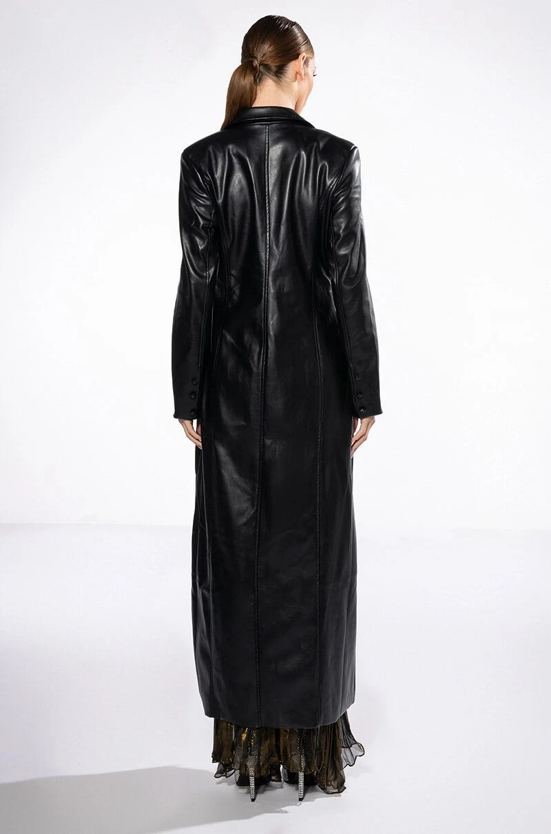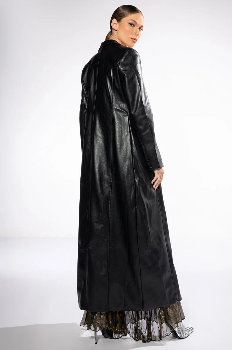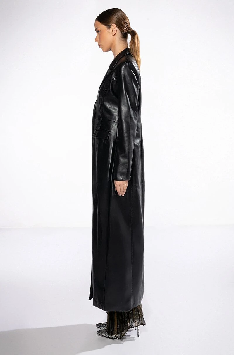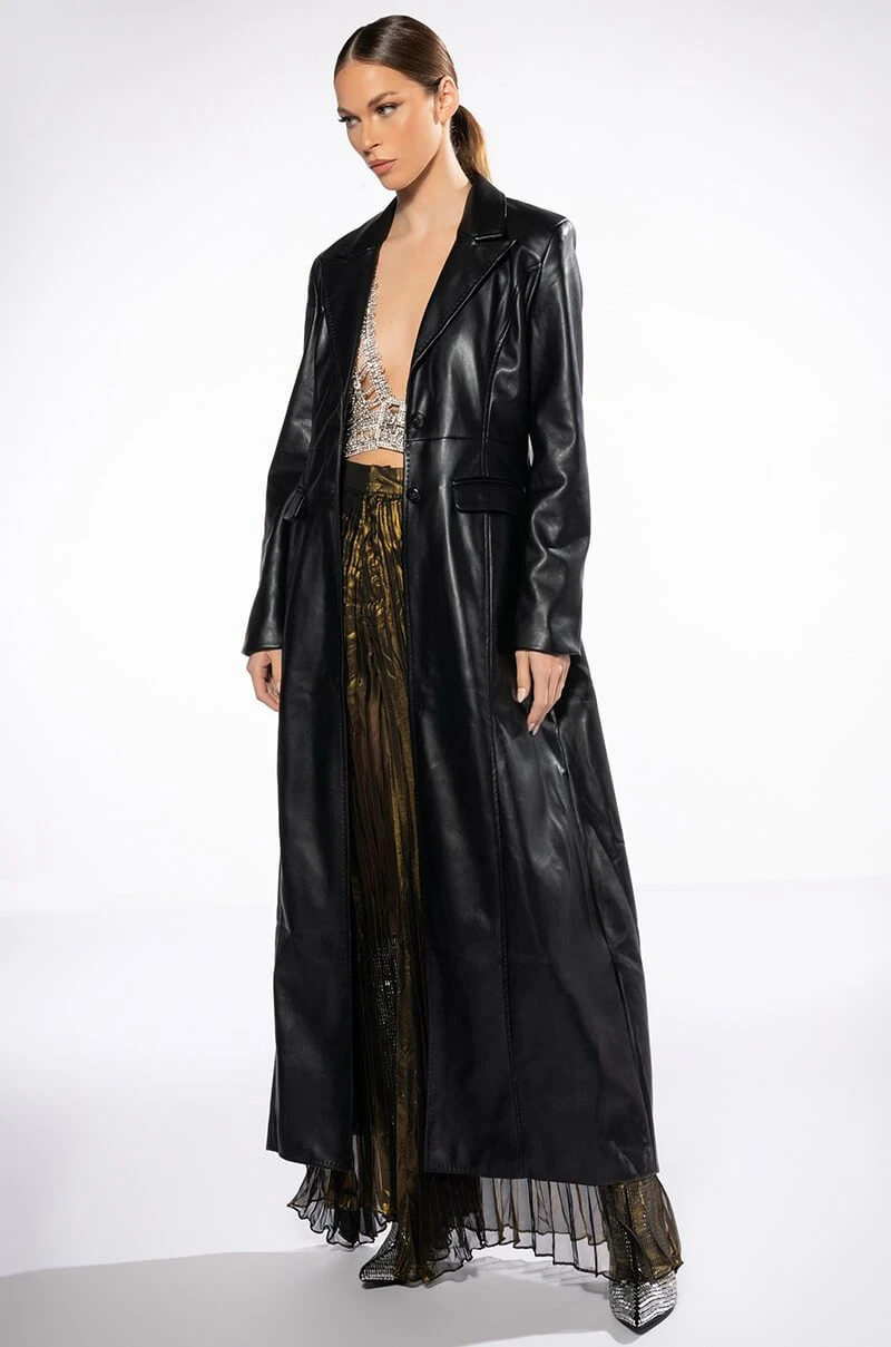 The AKIRA Label Beyond Classic Long PU Trench With Cheetah Lining is made from a smooth vegan leather fabrication and features padded shoulders, a wide notch lapel collar with baste stitching, long sleeves with ornate crown-embossed metal buttons, lined front flap pockets, elongating princess seam detailing, satiny cheetah print lining, and a maxi-length silhouette. Complete with ornate crown-embossed metal button front closures.