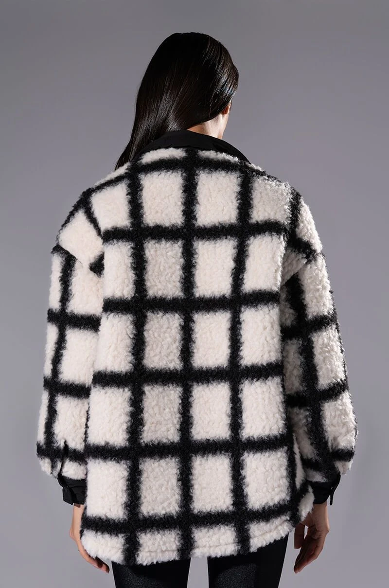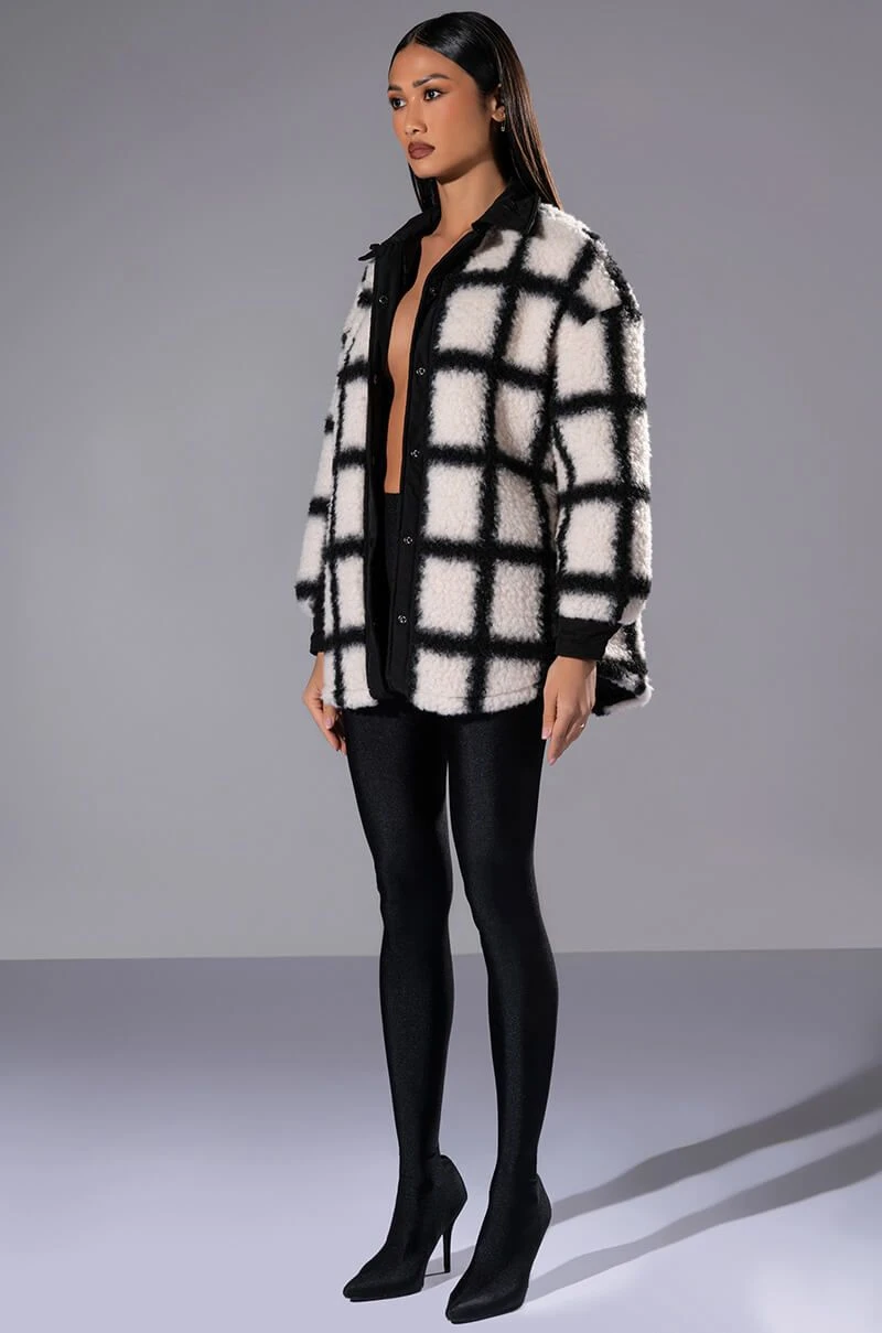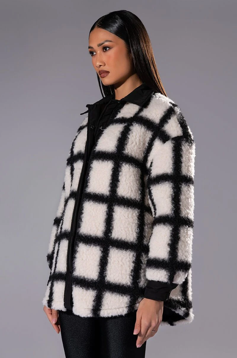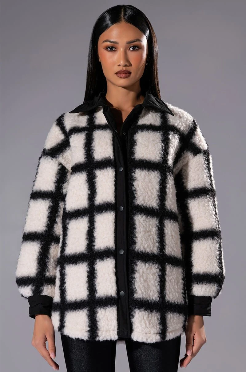 The AKIRA Label Bore Me More Boxy Sherpa Shacket is made from a fuzzy sherpa fabrication base and features a colorblock grid pattern, a collared nylon neckline, long sleeves with snap button nylon cuffs, side pockets, light polyester lining, a boxy silhouette, and snap button down front closures. Pair this piece with fitted leggings and combat boots to complete your cozy seasonal look.