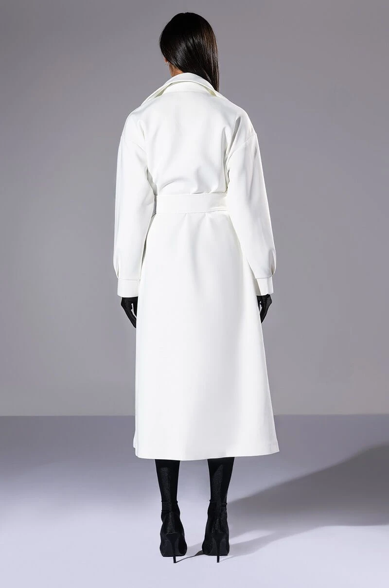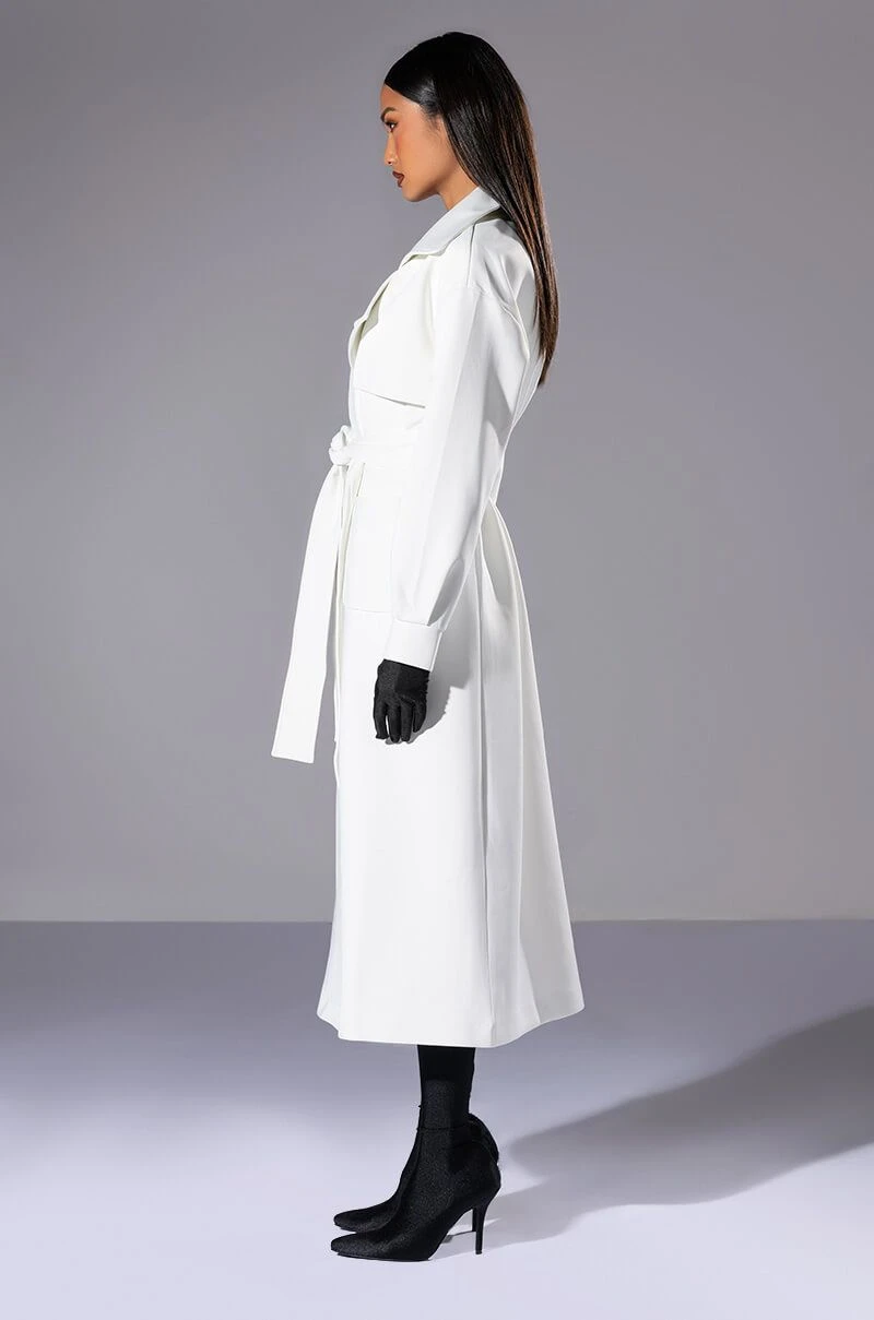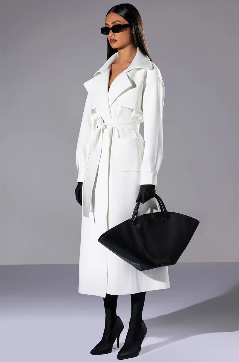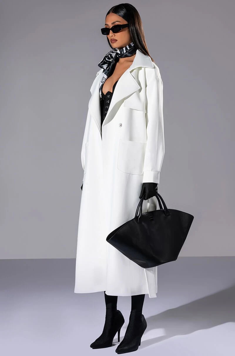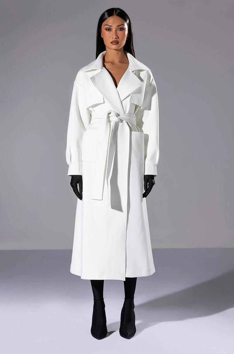 The AKIRA Label Cannes Luxe Scuba Trench is made from a smooth scuba fabrication and features a wide notch collar, storm flaps, long blouson sleeves with wide cuffs, front patch pockets, polyester lining, a longline silhouette, a tie waist detail, and a single snap button double breasted front closure.