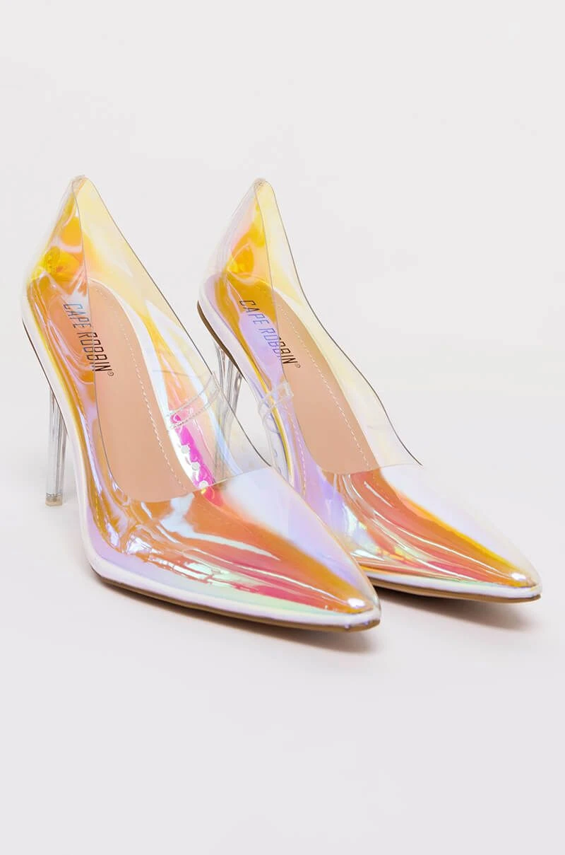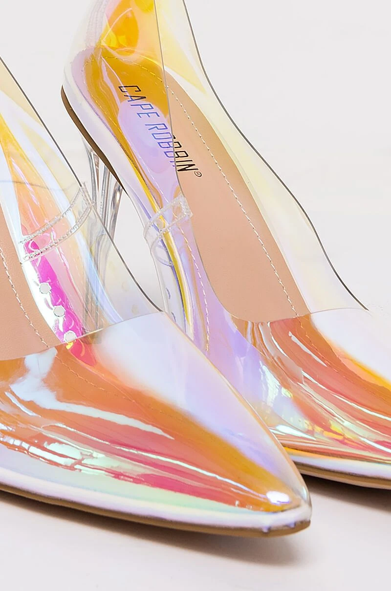Cinderella goes to Burning Man. The CAPE ROBBIN Holographic PVC Stiletto Pump is a trippy take on the PVC heel. This pointy toe shoe features a holographic PVC upper, lucite heel, pointed toe, and a faux leather upper sole. Style with reflective pieces for an out of this world look.
