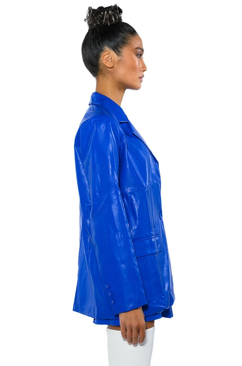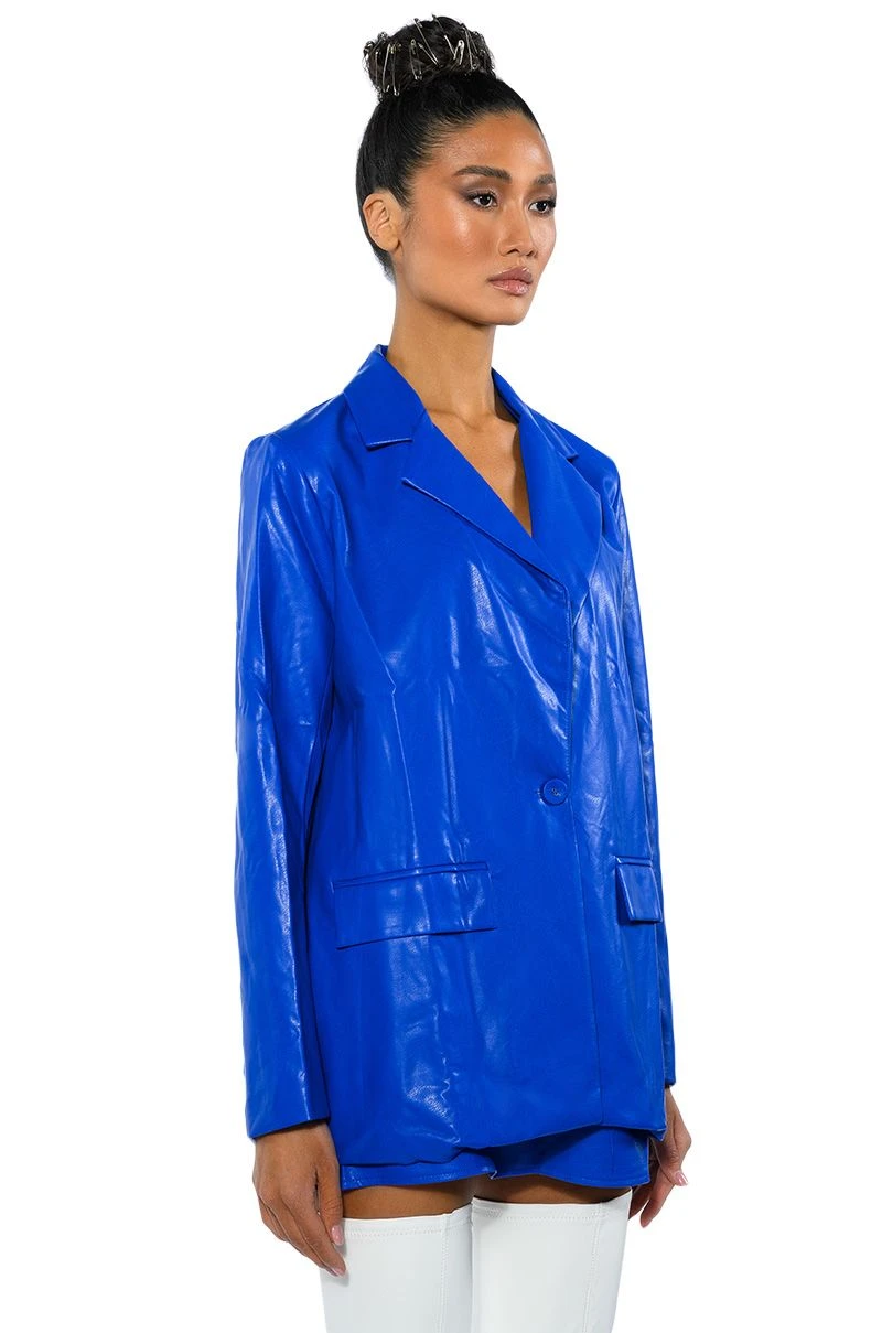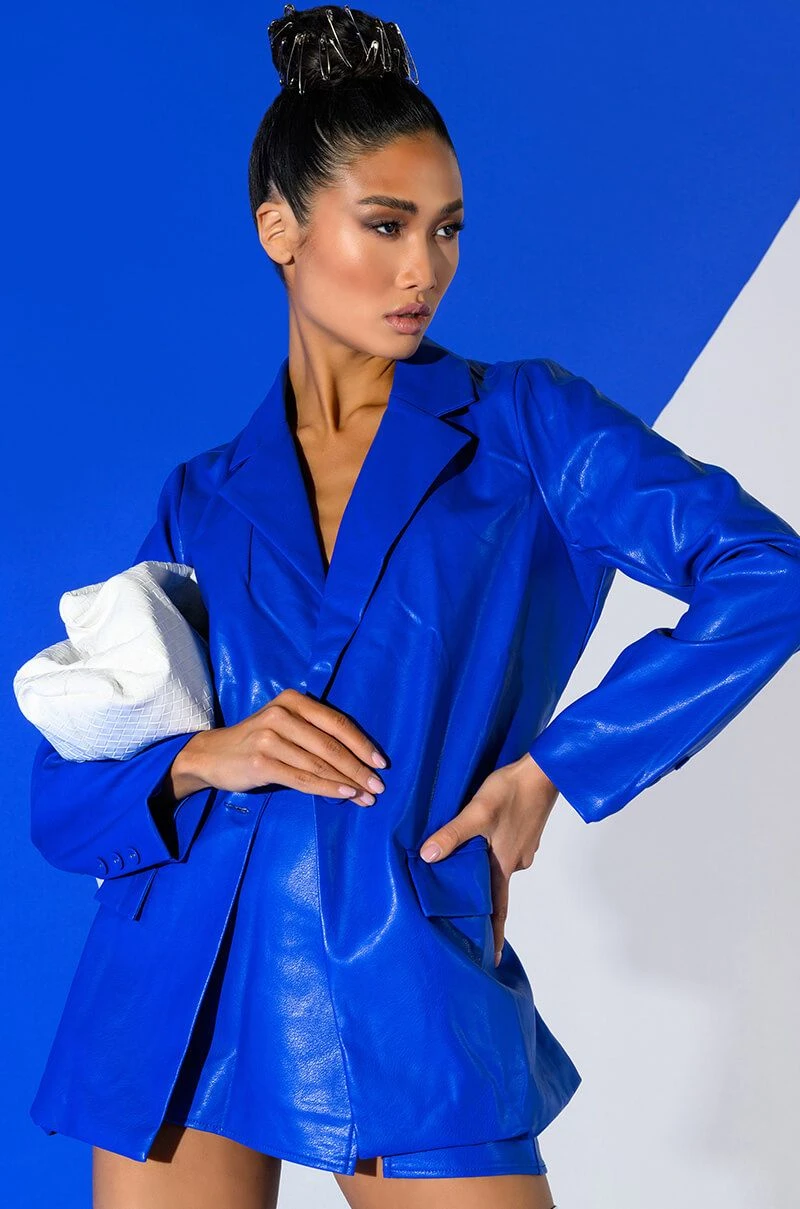 The AKIRA Label Determined Mind Faux Leather Blazer is a faux leather longline blazer featuring a notched lapel collar, a single front button closure, long sleeves, and a satin inner lining. Complete with flap front pockets and button cuff detailing. Pair this piece with the matching AKIRA Label Determined Mind Faux Leather Mini Skirt and sneakers to finish off your edgy yet tailored look.