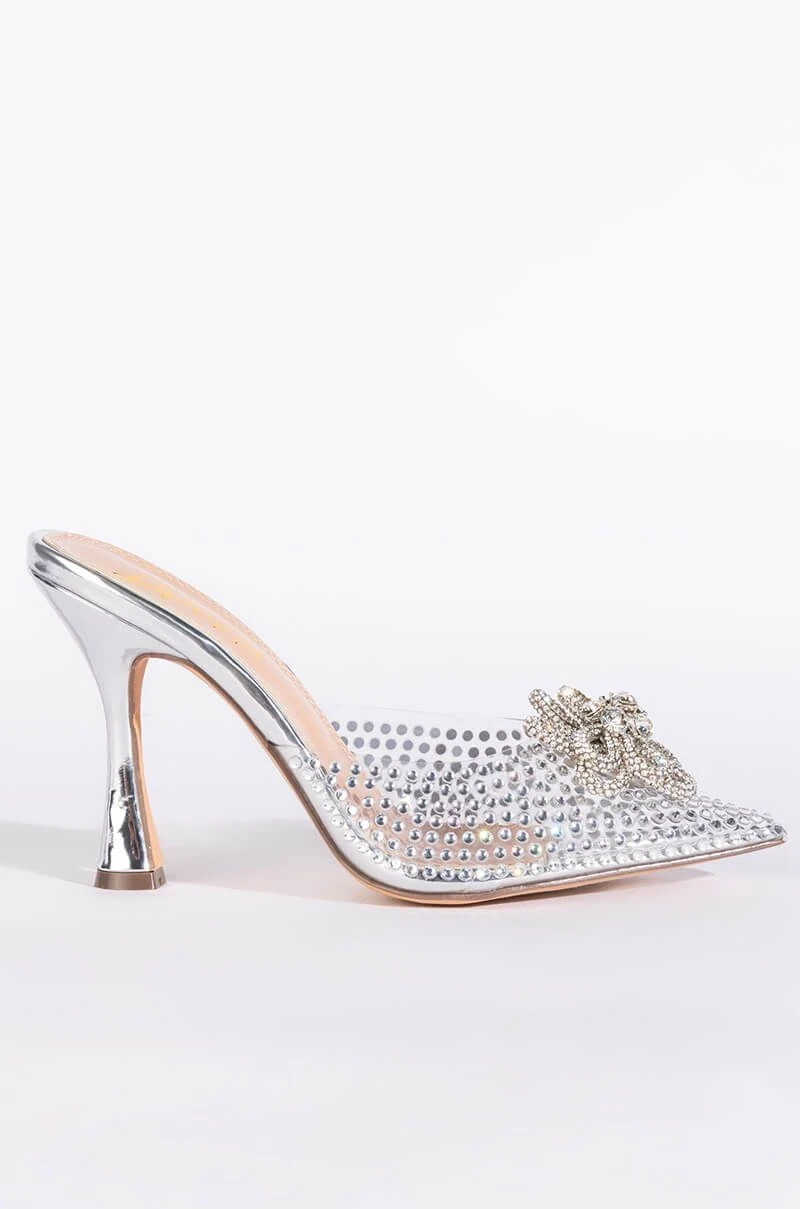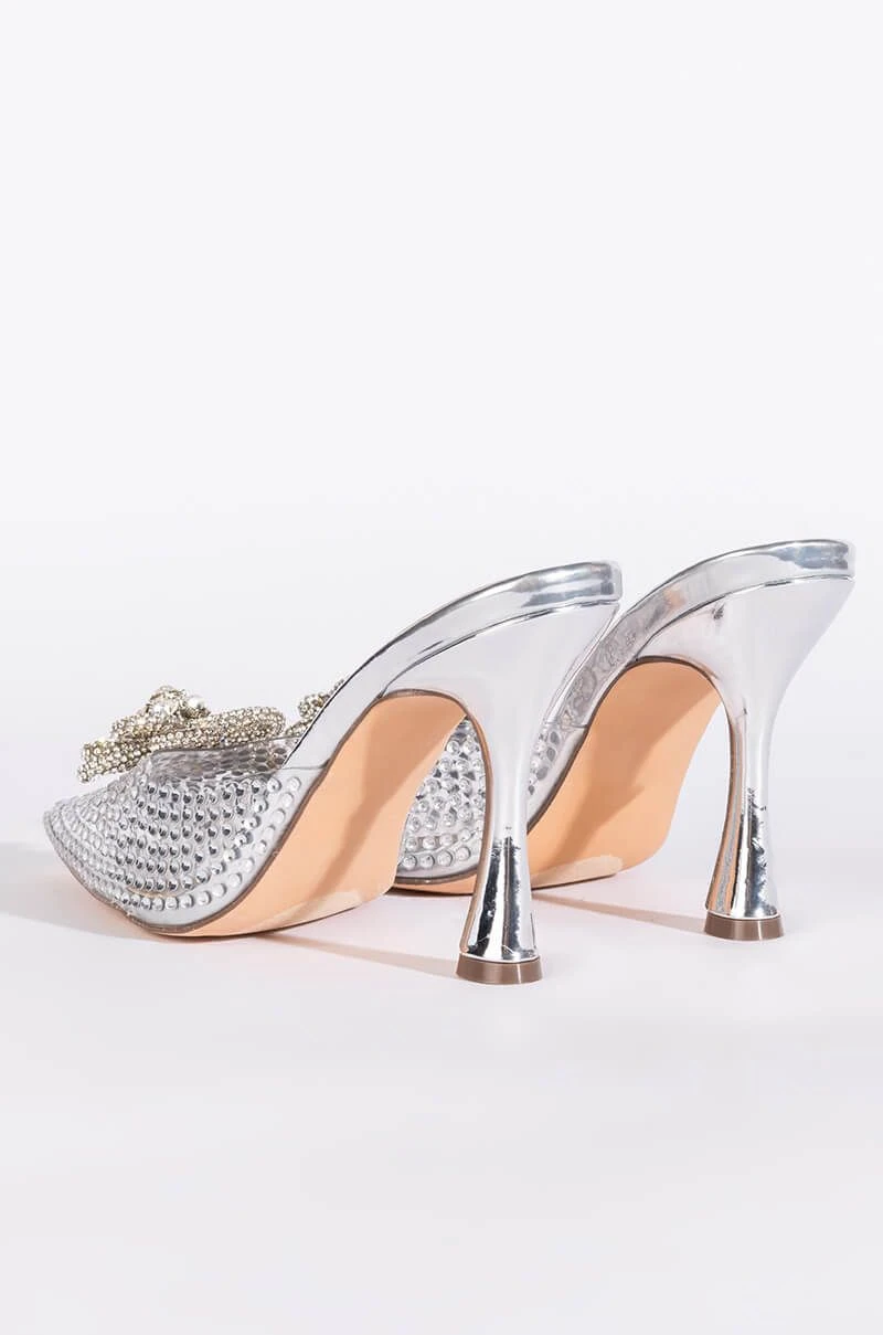 Divine intervention brought this shoe to you! The Divinny Embellished Pump In Silver features a tonal rhinestone embellished PVC upper, a pointed toe, a metallic midsole, coordinating stiletto heel, and a rhinestone floral bow. Style this slip on style with a sexy satin mini dress for a sparkly night out.
