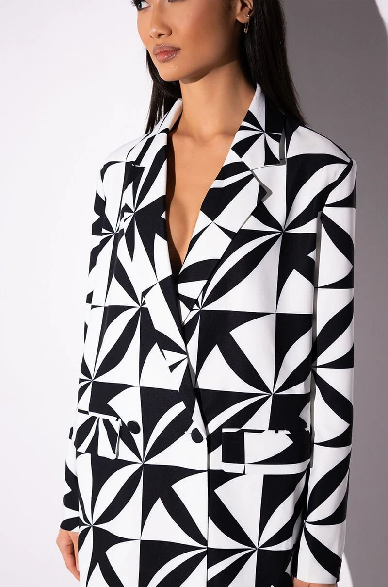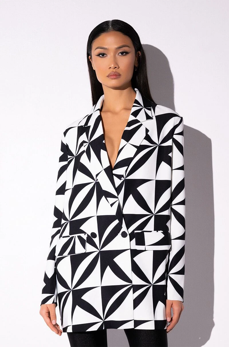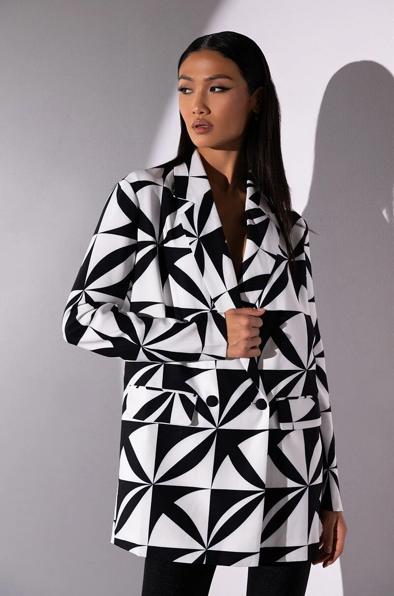 The AKIRA Label Escape Printed Oversized Blazer features a smooth fabrication, a graphic print pattern, long sleeves, and a longline silhouette. Complete with welted front pockets, a satin inner lining, and a single double breasted front button closure. Pair with wide leg trousers and a crop top for your next night out!