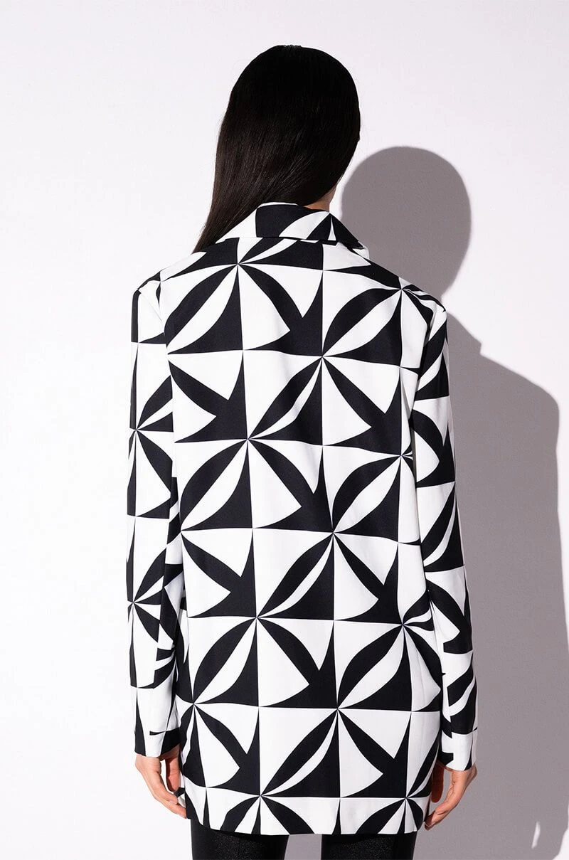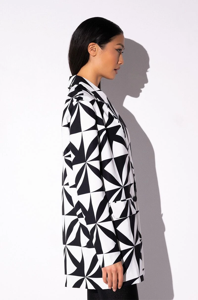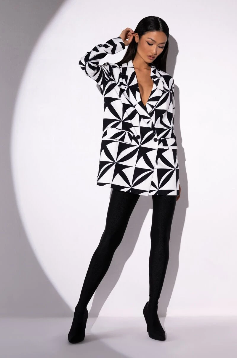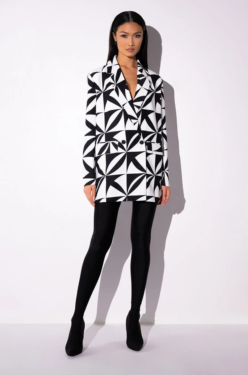 The AKIRA Label Escape Printed Oversized Blazer features a smooth fabrication, a graphic print pattern, long sleeves, and a longline silhouette. Complete with welted front pockets, a satin inner lining, and a single double breasted front button closure. Pair with wide leg trousers and a crop top for your next night out!