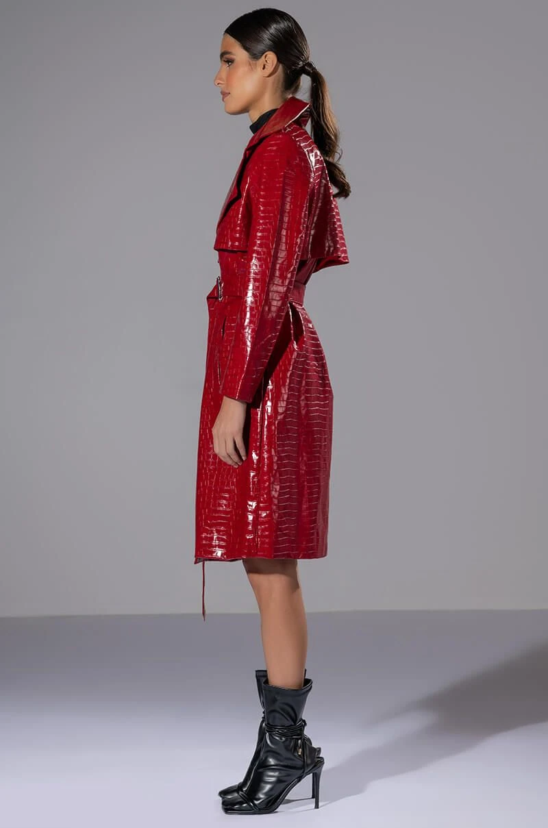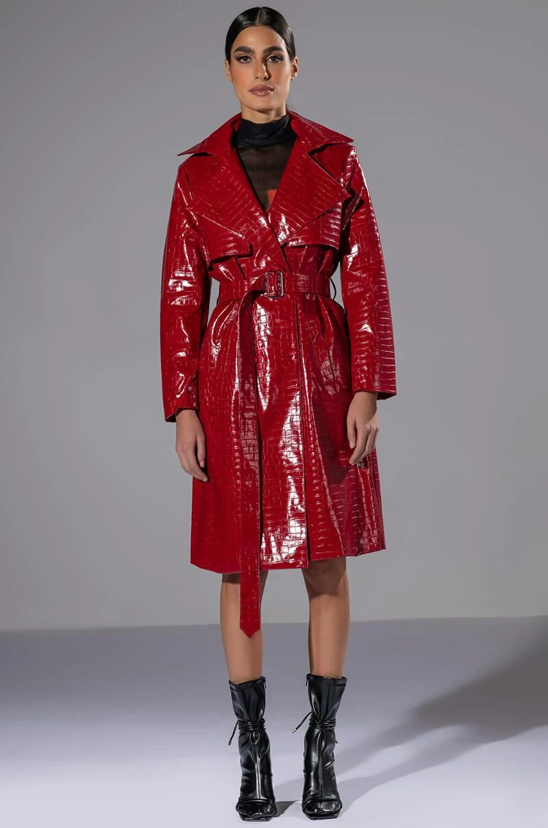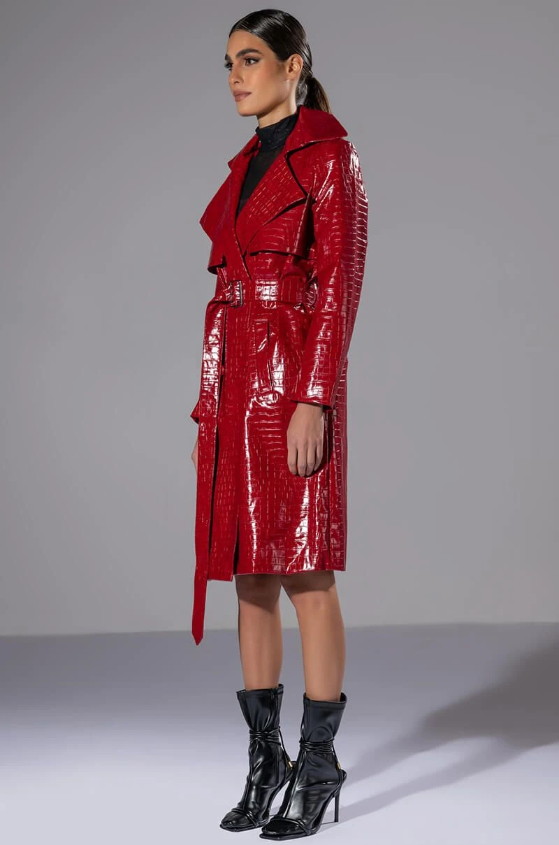 Command the room in the Feeling Extra Bossy Red Croc Trench! This bold trench coat features a croc embossed faux leather fabrication, long sleeves, a wide lapel collared neckline, and a duster length silhouette. Complete with a double button front closure, slant side pockets, a coordinating waist belt, and satin inner lining. Pair with stiletto thigh-high boots and clutch for that boss babe look!