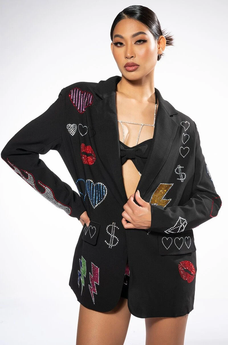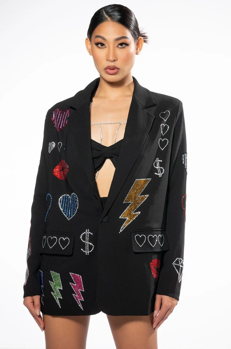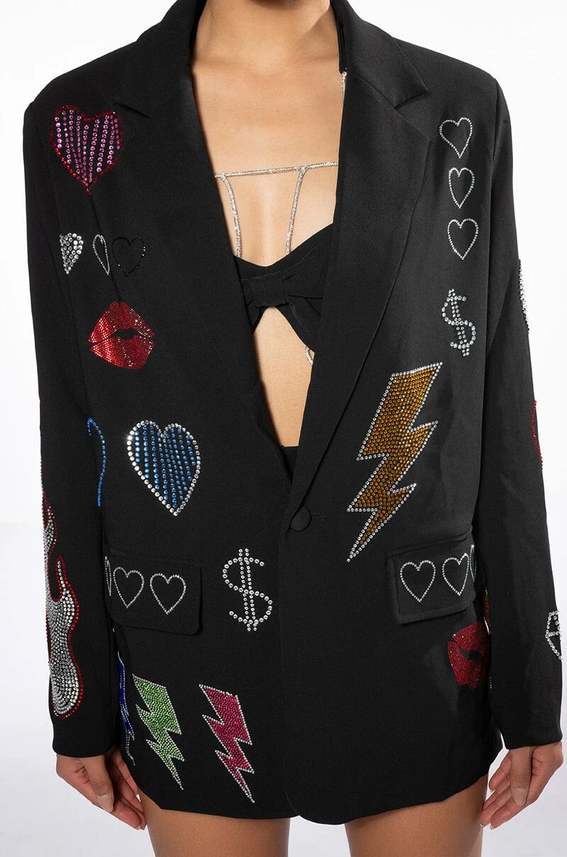 The AKIRA Label Flashing Lights Rhinestone Embellished Blazer is made from a classic blazer fabrication and features a notch collar, padded shoulders, long sleeves, multicolor emoji-shaped rhinestone embellishments, front flap pockets, light polyester lining, and a single front button closure. Pair this piece with the matching AKIRA Label Flashing Lights Rhinestone Rope Bralette and Flashing Lights Rhinestone Embellished Booty Short to complete your look.