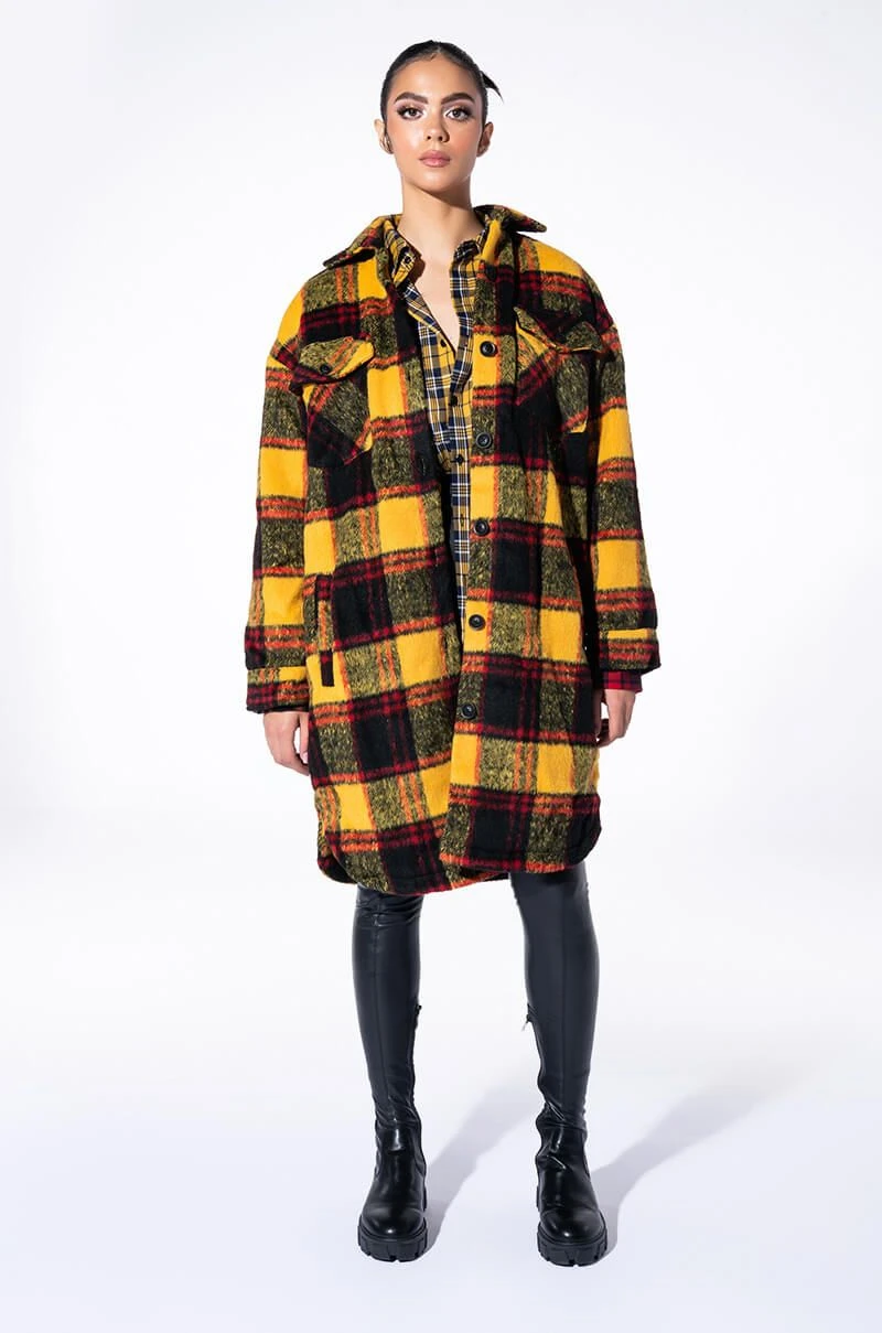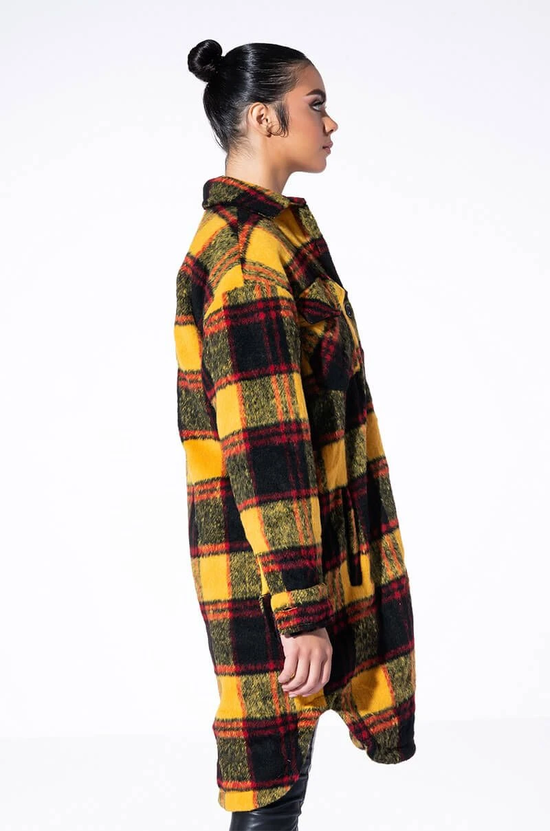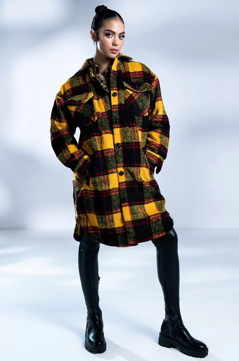 The AKIRA Label Fuzzy Plaid Long Shacket With Quilted Lining is a fuzzy wool-blend longline jacket featuring long sleeves, a button down front placket, a collared neckline, and functional button front chest pockets. Complete with a quilted satin inner lining, a rounded hemline, a below-the-knee silhouette, and button cuff detailing. Pair with an oversized t-shirt dress and thigh high boots for a casual luxe look.