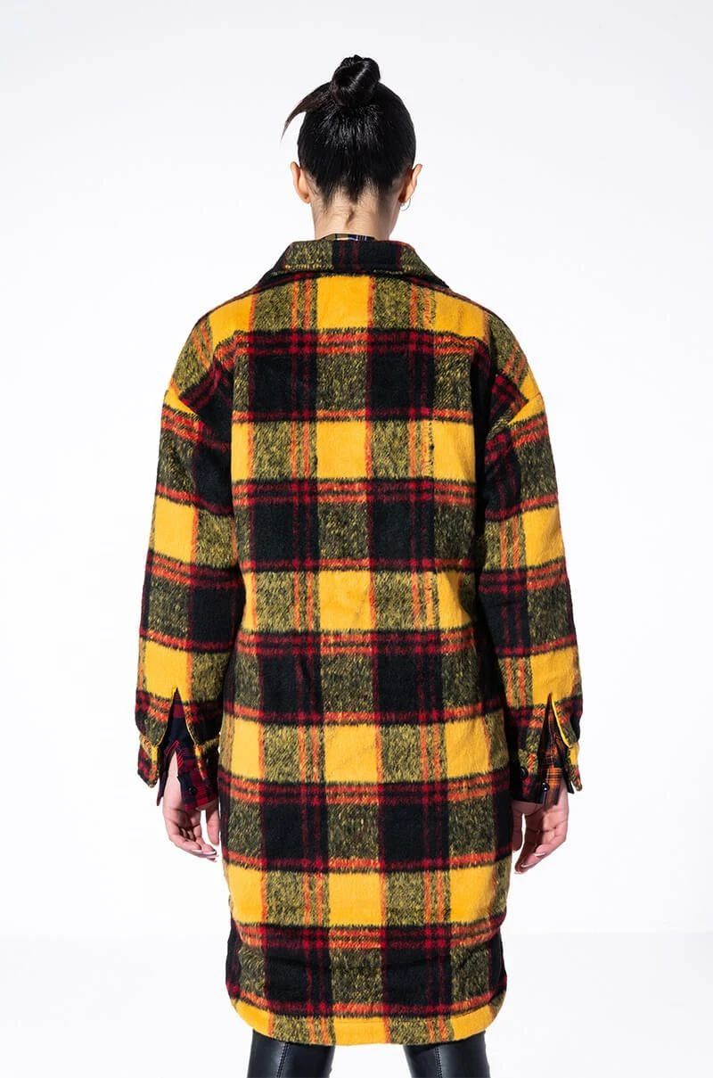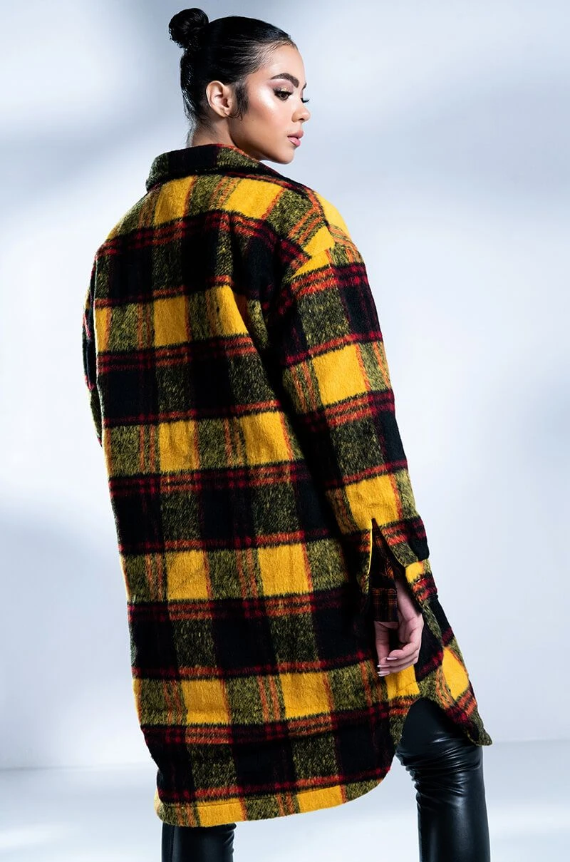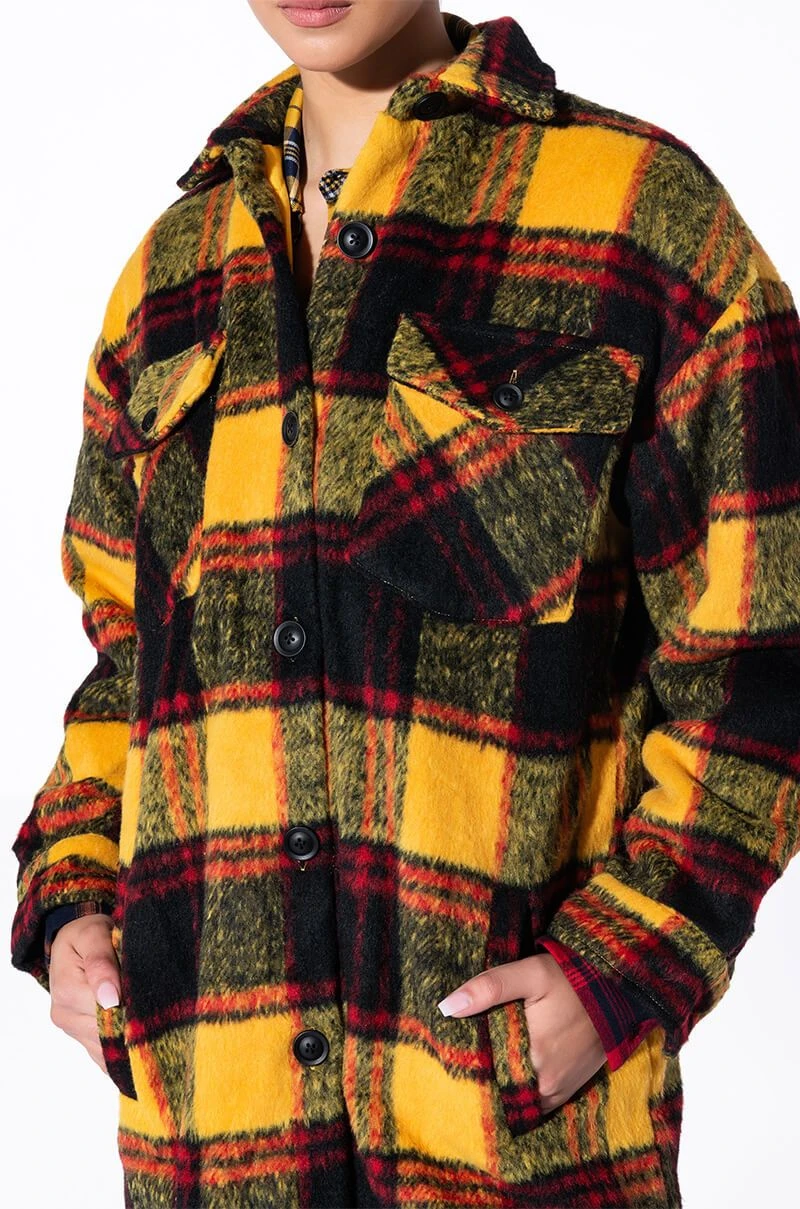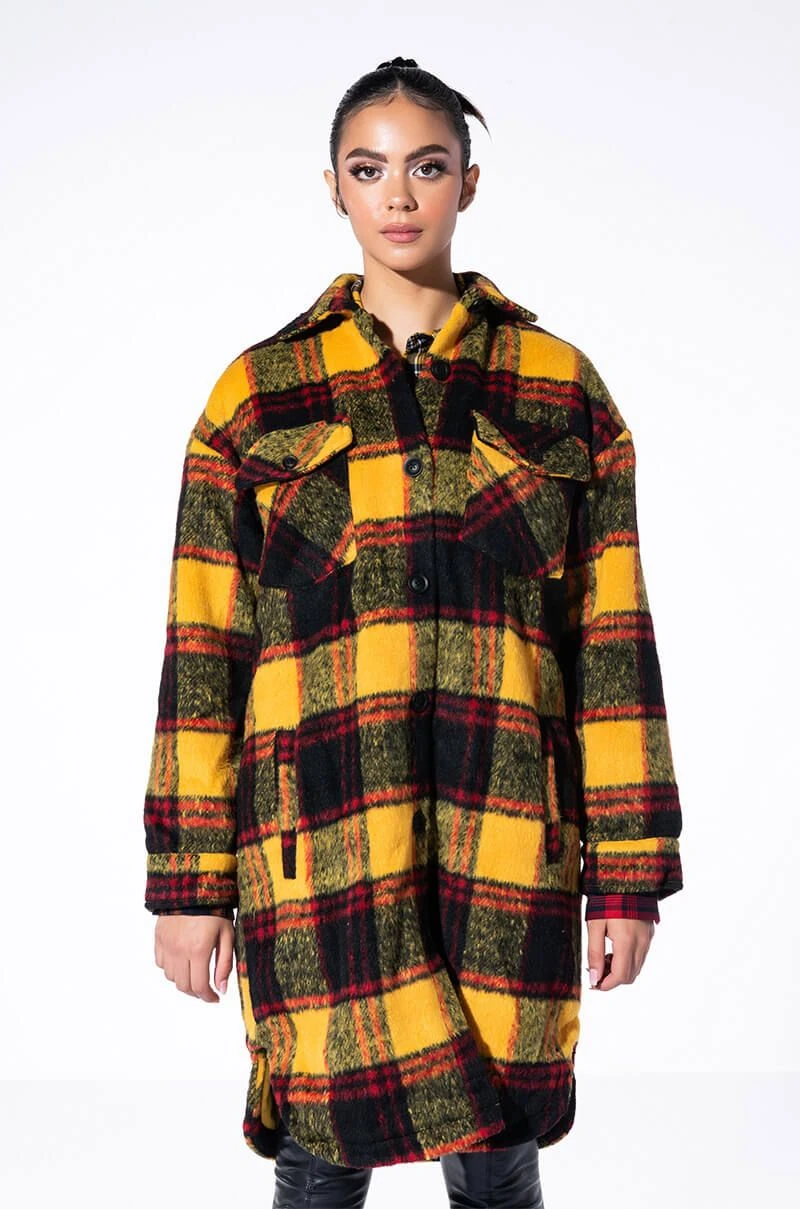 The AKIRA Label Fuzzy Plaid Long Shacket With Quilted Lining is a fuzzy wool-blend longline jacket featuring long sleeves, a button down front placket, a collared neckline, and functional button front chest pockets. Complete with a quilted satin inner lining, a rounded hemline, a below-the-knee silhouette, and button cuff detailing. Pair with an oversized t-shirt dress and thigh high boots for a casual luxe look.