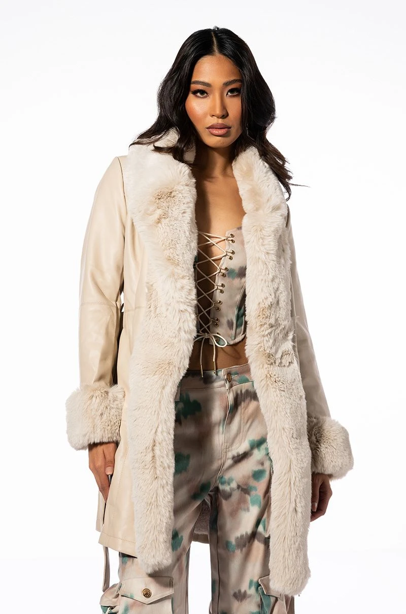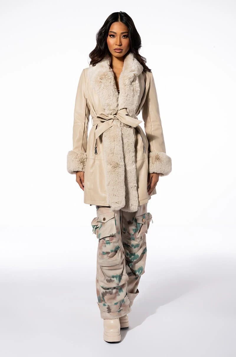 Do it for the gram. The AKIRA Label Gram Girl PU And Faux Fur Wrap Coat is a luxurious seasonal fave. It features ultra soft faux fur trim and lining, a vegan leather fabrication, a self tie at the waist, zip side pockets, and a slightly longline silhouette. Pair with a cozy beanie, a ribbed knit midi dress, and knee high boots for a complete look.