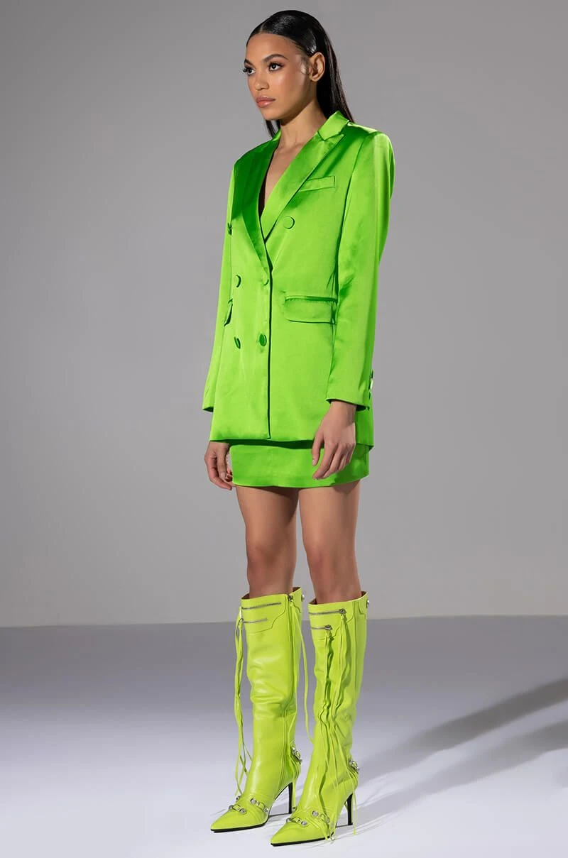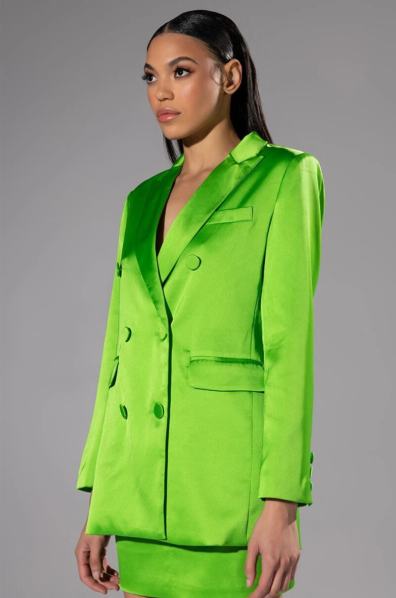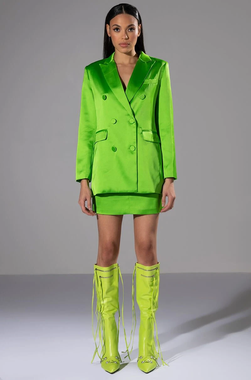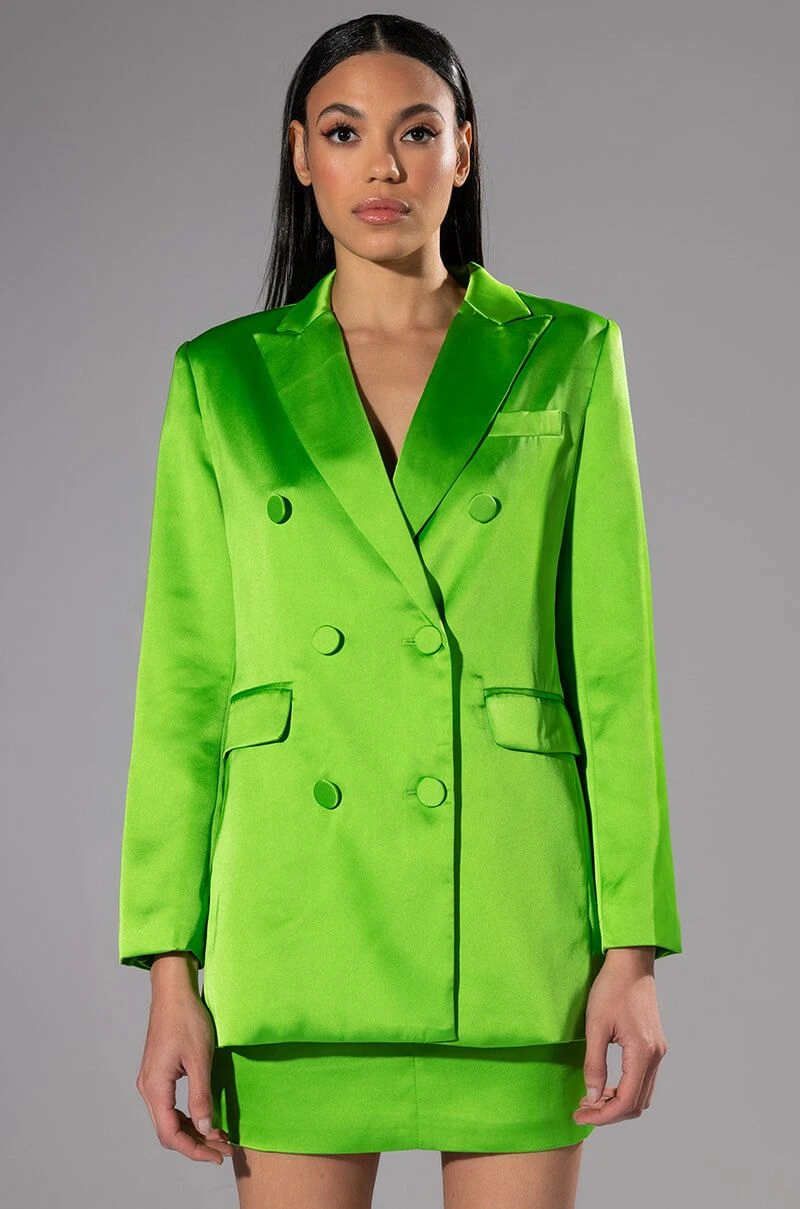 My money don’t jiggle jiggle, it folds! The Akira Label Gratitude Blazer and Mini Skirt Set features a smooth and sleek fabrication, padded shoulders, faux front and side pockets, a notch lapel, and a double-breasted silhouette with oversized button closures. The blazer is complete with a satin inner lining, long sleeves with faux button closures, and plunging neckline. This convertible piece can be worn solo as a mini dress, or pair it with some straight leg pants and pumps for an executive look.