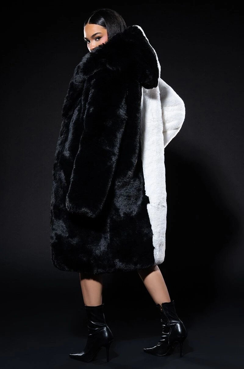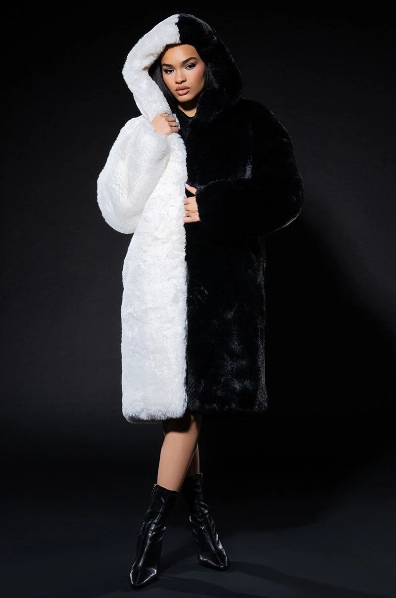 The AKIRA Label Half Half Bdubs Faux Fur Coat is made from a plush faux fur fabrication and features half and half colorblock paneling, an attached hood, long sleeves, a longline silhouette, light polyester lining, and a front tonal hook and eye front closure.