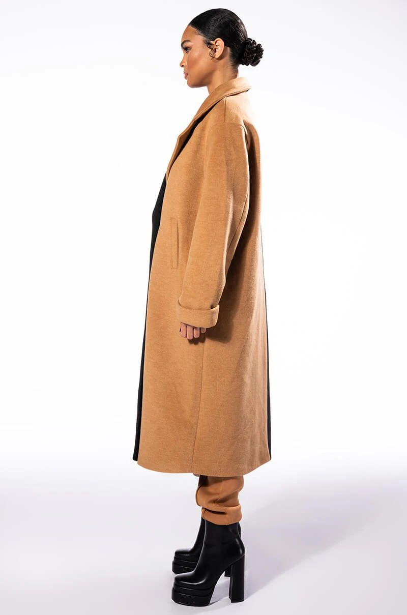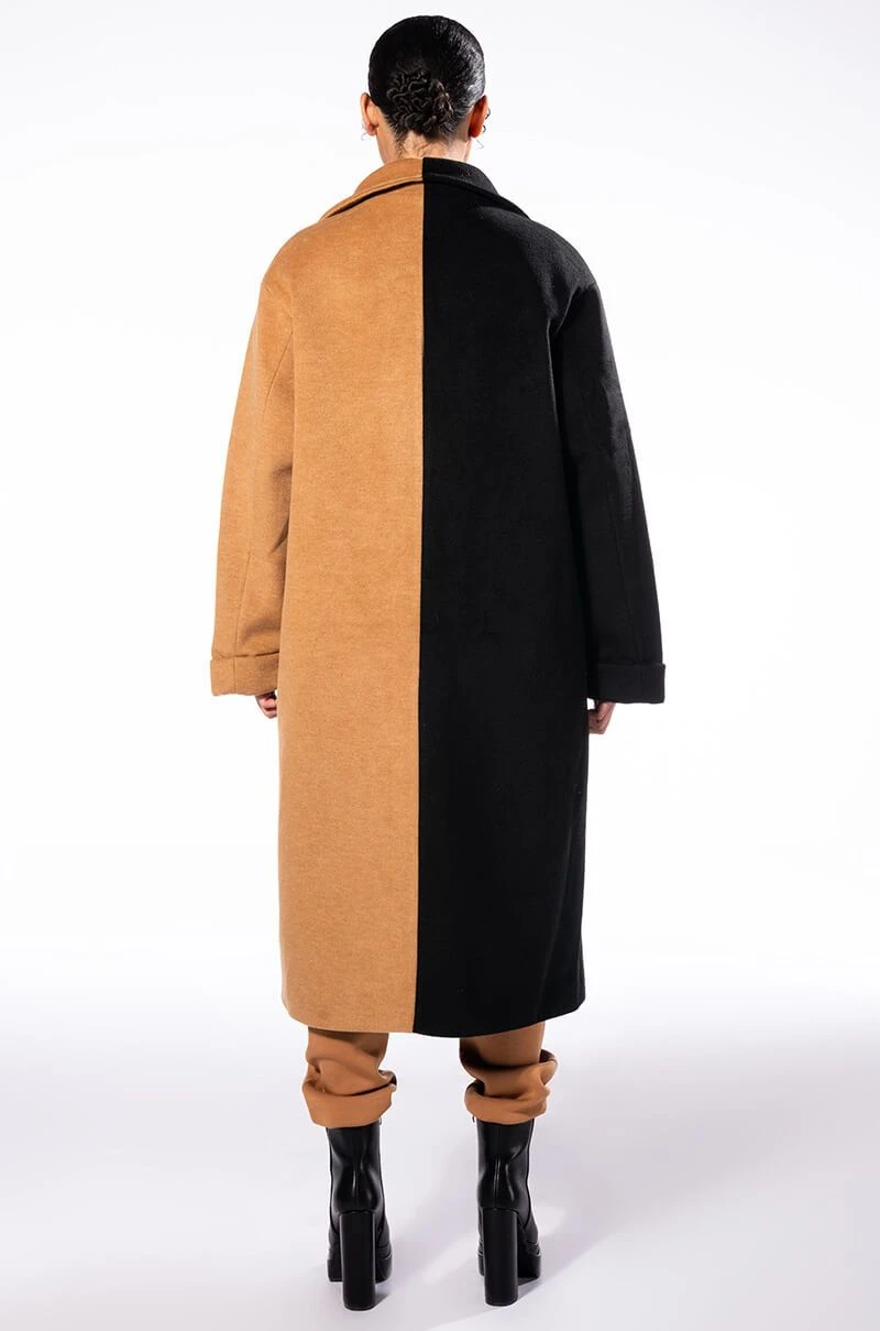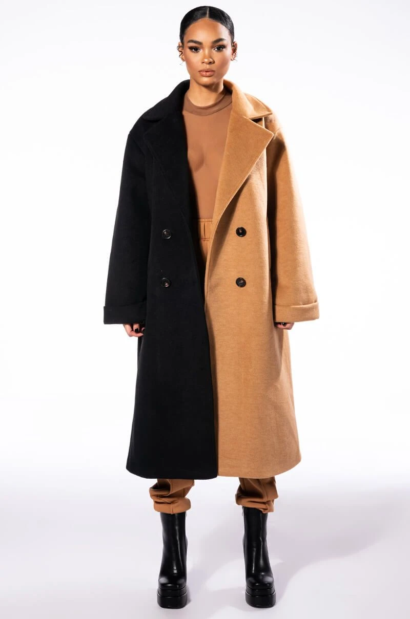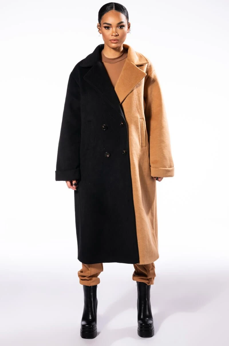 The AKIRA Label Half N Half Wool Like Trench is made from a structured, wool-like fabrication and features a colorblock half, a wide notch lapel collar, long cuffed sleeves, slant side pockets, slick polyester lining, and an oversized fit. Complete with a double-breasted front button closure.