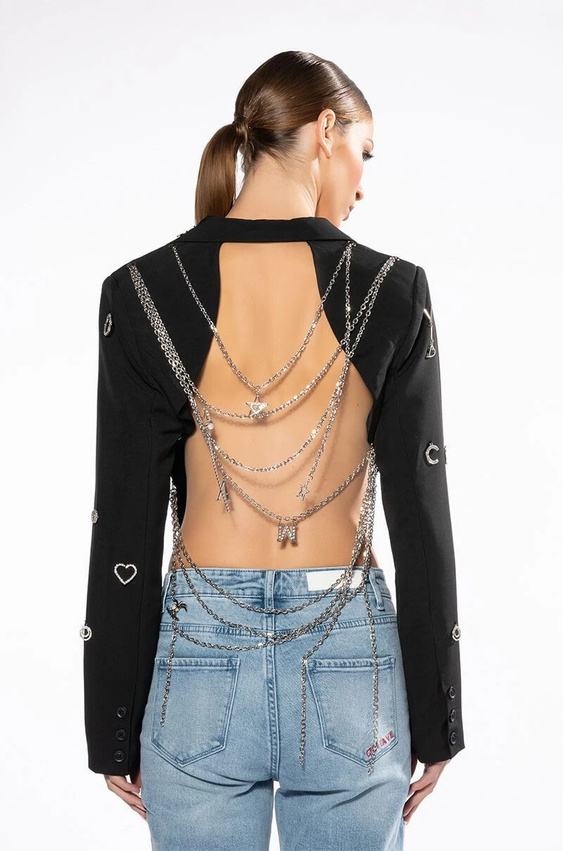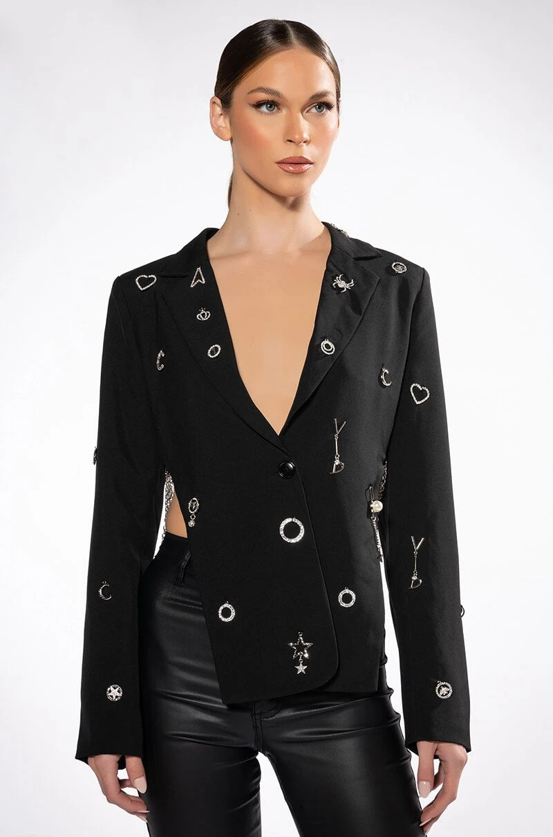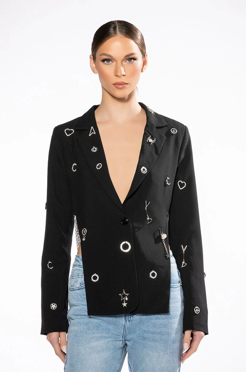 Use your charms to get your way in The AKIRA Label I Put A Spell On You Open Back Charm Blazer! This glam blazer features padded shoulders, a notch lapel collar, long sleeves with button wrists, an ultra-cropped cut, open back, and extended front panels. Complete with silver metallic hardware, pave rhinestone charm detailing throughout, cross back chain link detailing, an inner satin lining and a single front button closure. Style this unique piece with bralettes and fitted trousers for a complete look.