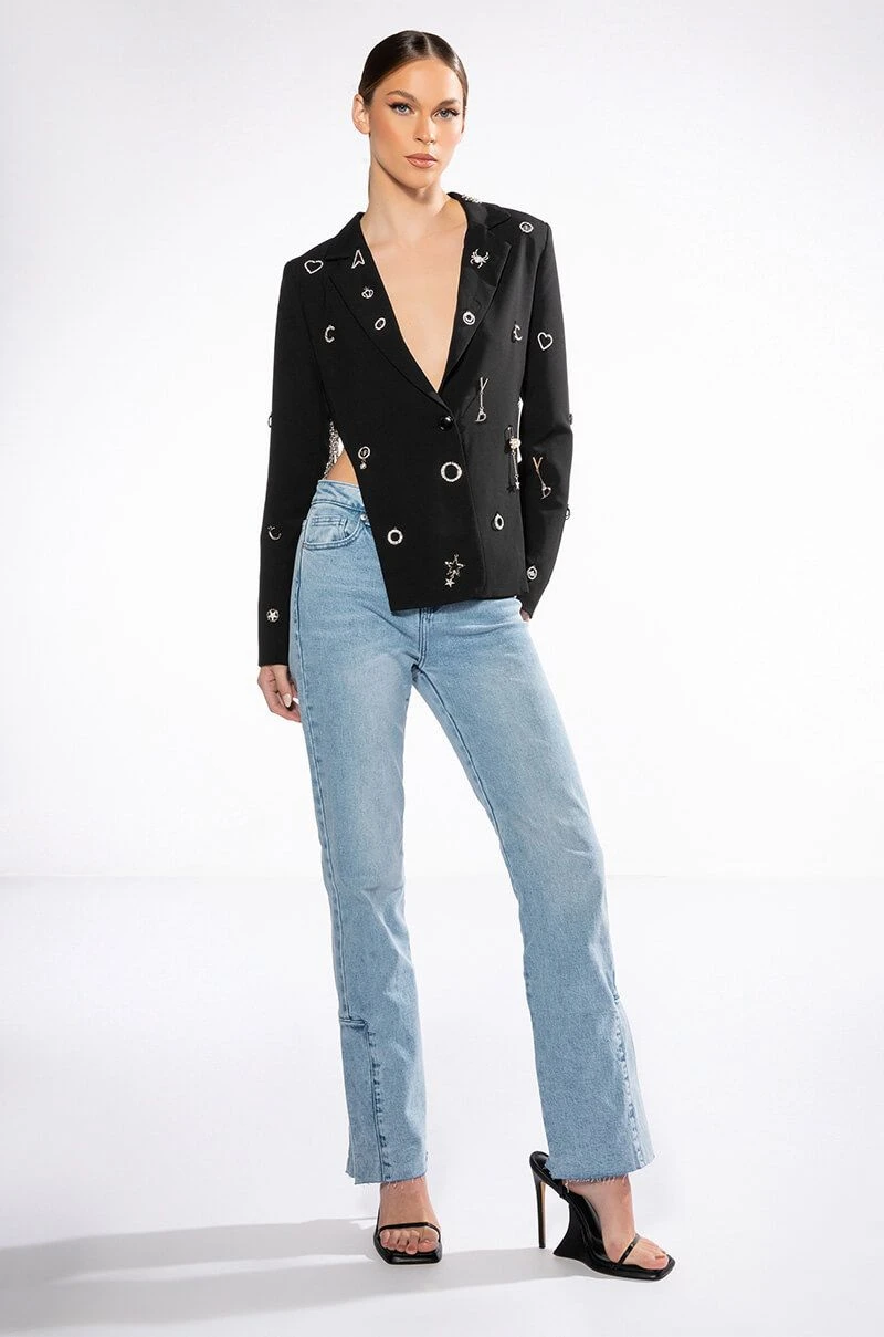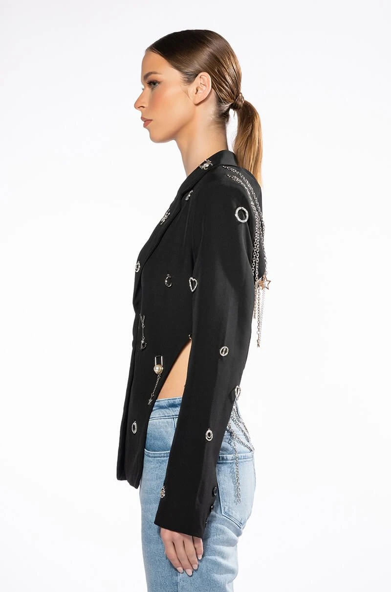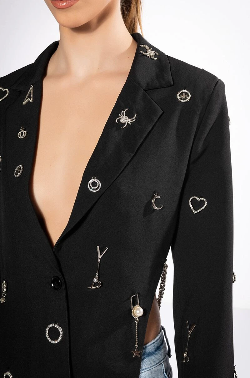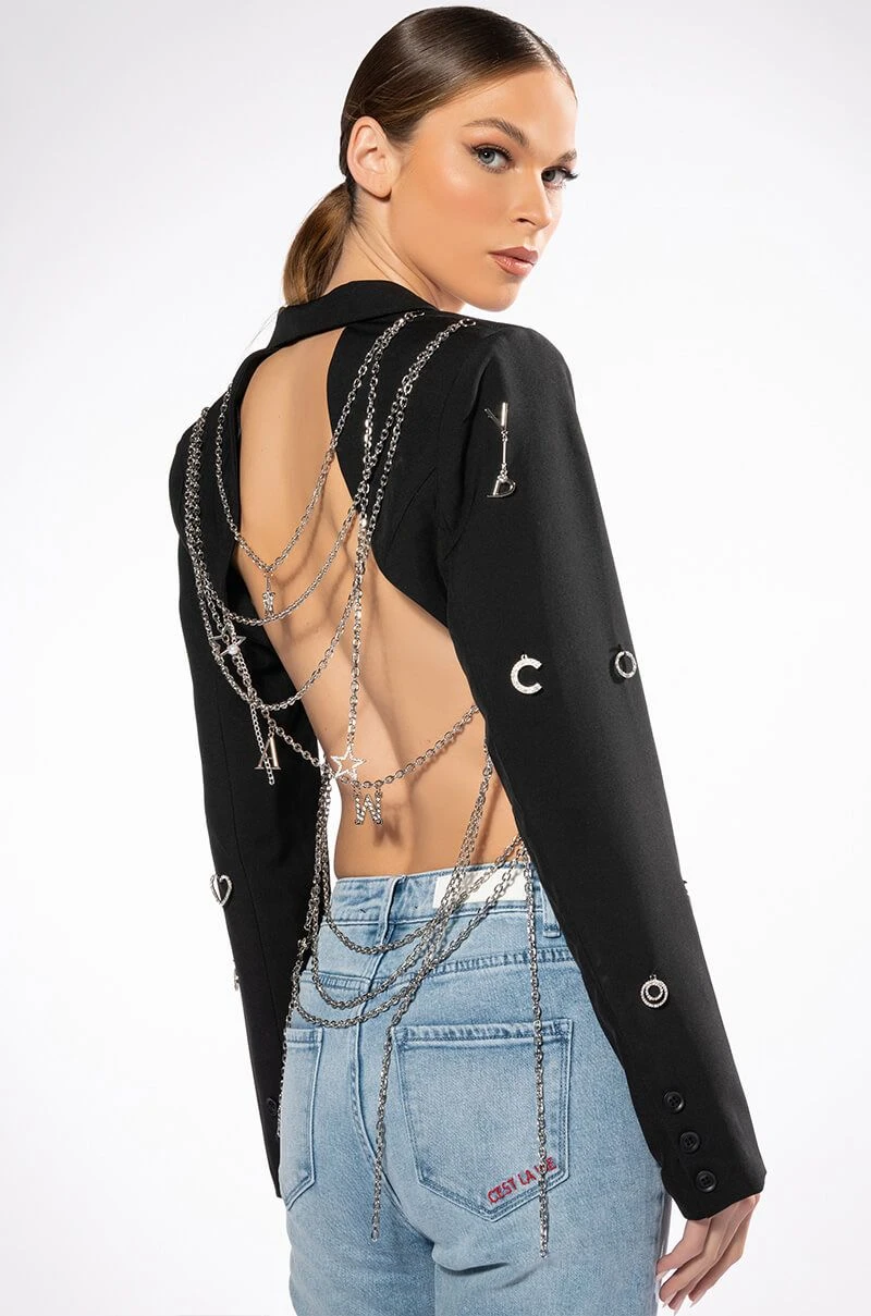 Use your charms to get your way in The AKIRA Label I Put A Spell On You Open Back Charm Blazer! This glam blazer features padded shoulders, a notch lapel collar, long sleeves with button wrists, an ultra-cropped cut, open back, and extended front panels. Complete with silver metallic hardware, pave rhinestone charm detailing throughout, cross back chain link detailing, an inner satin lining and a single front button closure. Style this unique piece with bralettes and fitted trousers for a complete look.