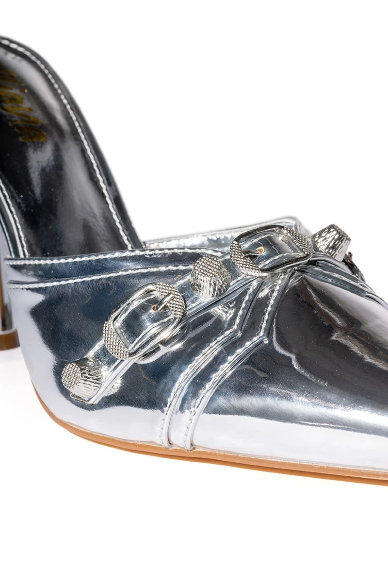 The Isn’t It Romantic Silver Metallic Pump features a metallic vegan leather upper, a pointed toe design, a mule silhouette, a coordinating metallic midsole, a slim stiletto heel, and silver buckle detailing. Pair this slip on style with a sexy satin mini dress for a night out.