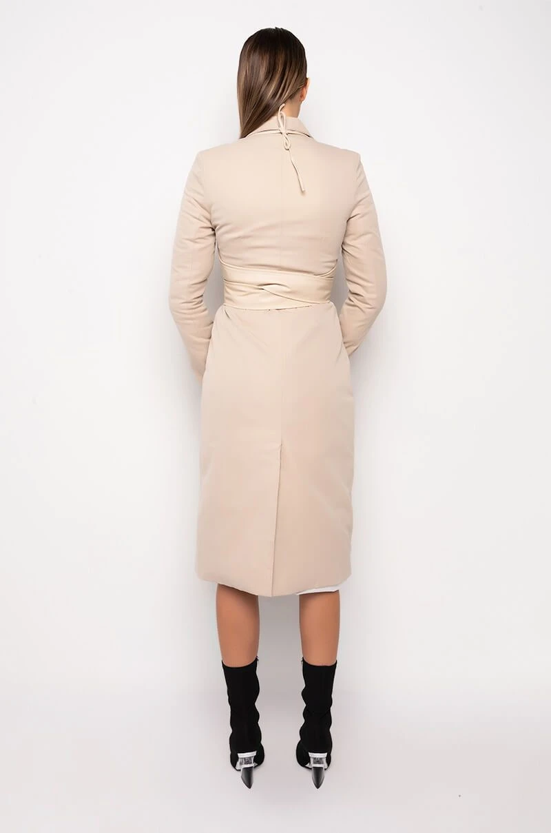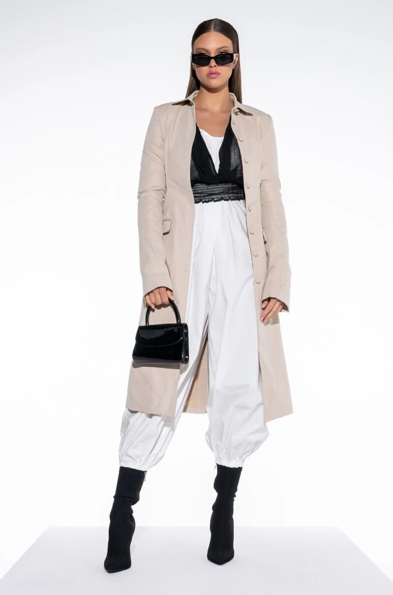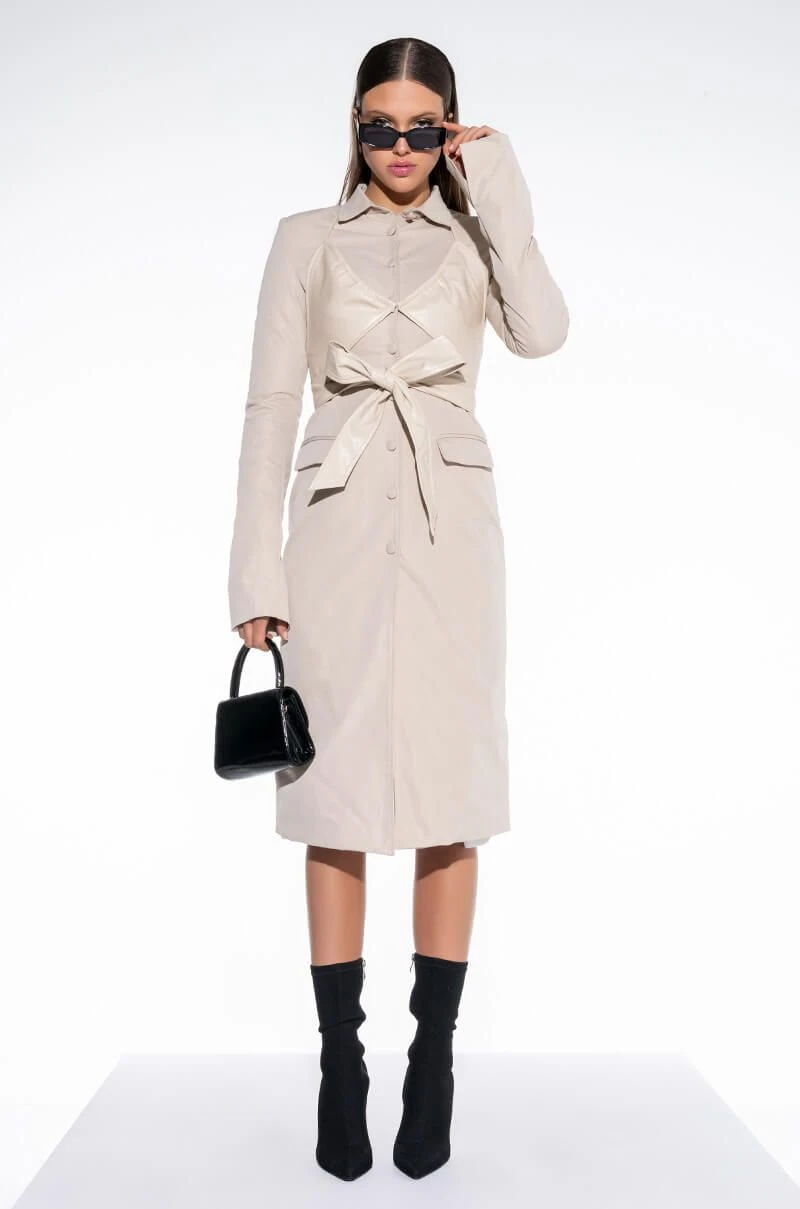 The AKIRA Label Layered Legion Trench Coat is a classic rain jacket featuring a smooth knit fabrication base, a foldover collar, padded shoulders, long sleeves, duster length silhouette, and front flap pockets. Complete with a layered pleather bralette with tie waist, sleek inner lining, and slits at the wrists and back.