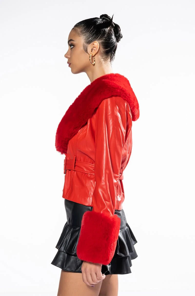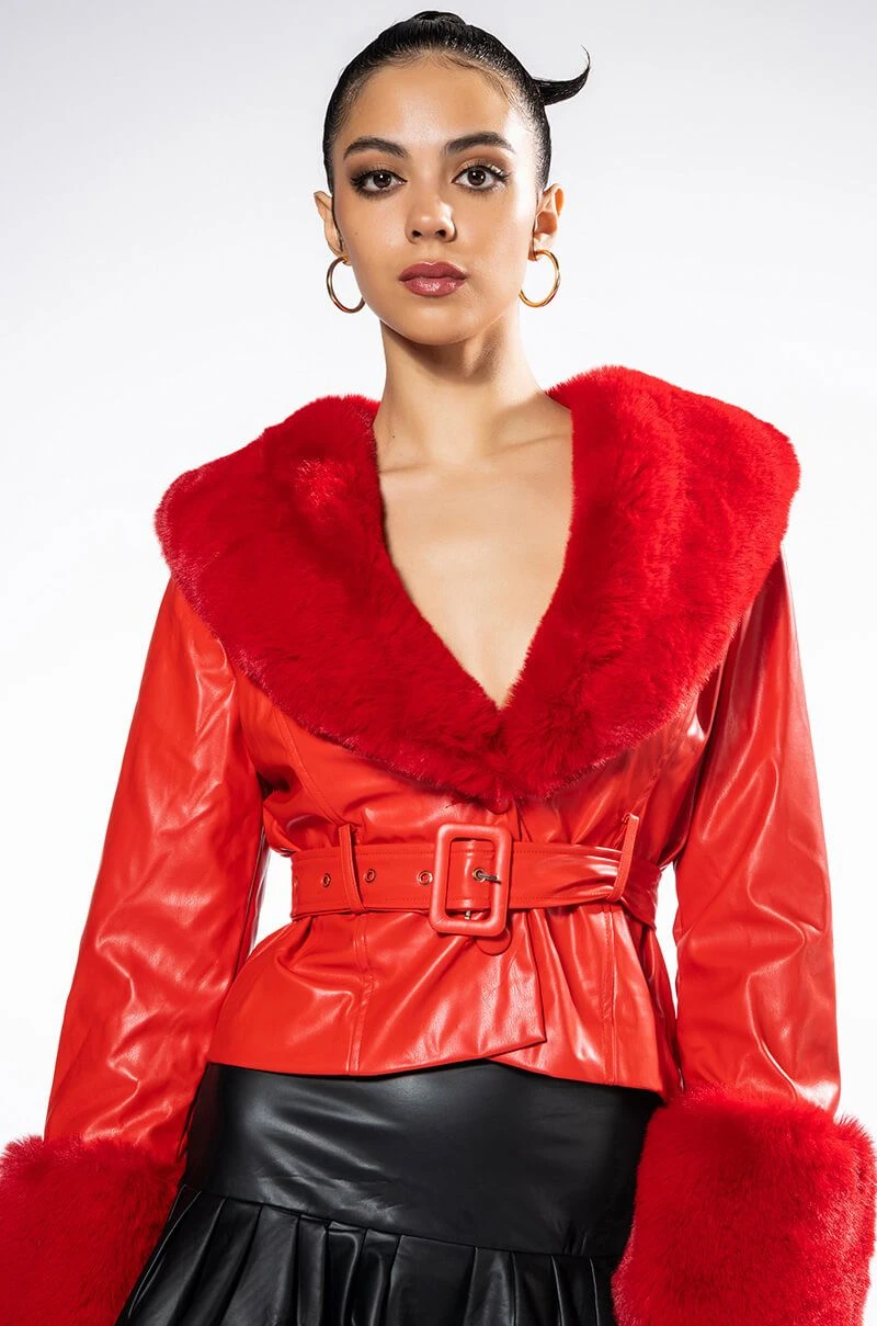Channel your inner 2000’s starlet with The AKIRA Label Maddie Y2K Red Fur Trim Blazer! This chic layering piece is made from a soft vegan leather fabrication and features a wide plush faux fur trim collar, princess seam stitching, long sleeves with wide faux fur cuffs, lightweight lining, and belt loops with a coordinating, adjustable vegan leather buckle waist belt. Complete with a two-button front closure.