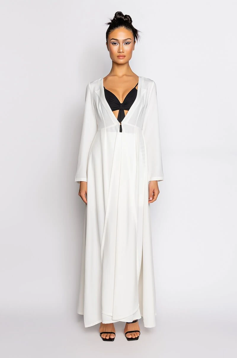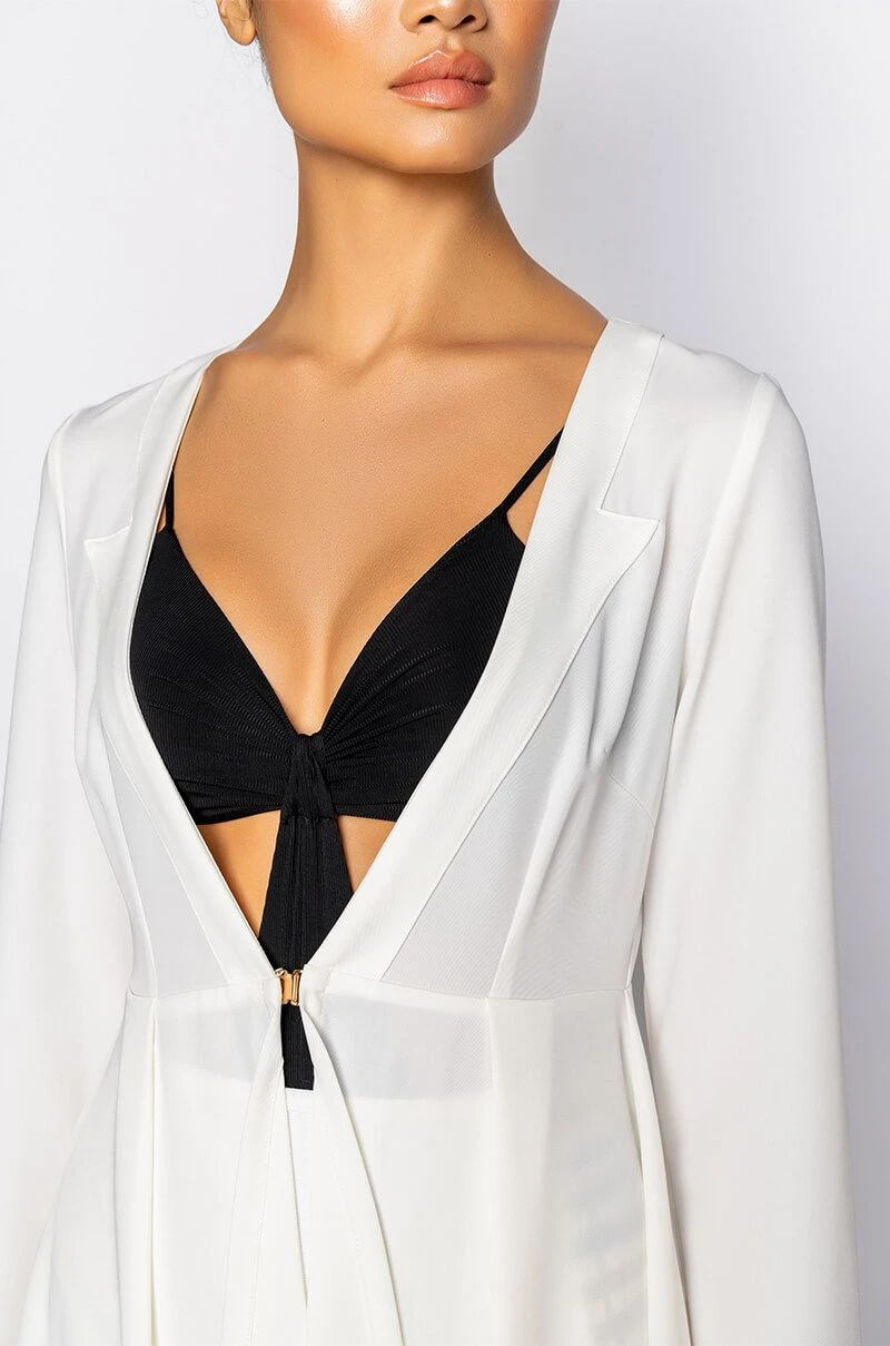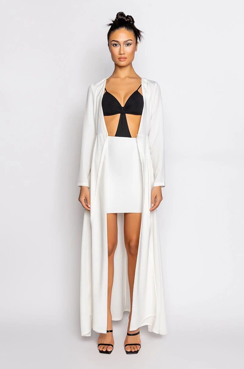 Cross this world in style with The AKIRA Label Moon River Long Sleeve Trench Blazer. This chic layering piece is made from a soft, lightweight fabrication and features a plunging neckline with notched collar stitch detailing, long sleeves, a longline silhouette, a cascading front detail, and a single gold metal hook and eye closure at the waist.