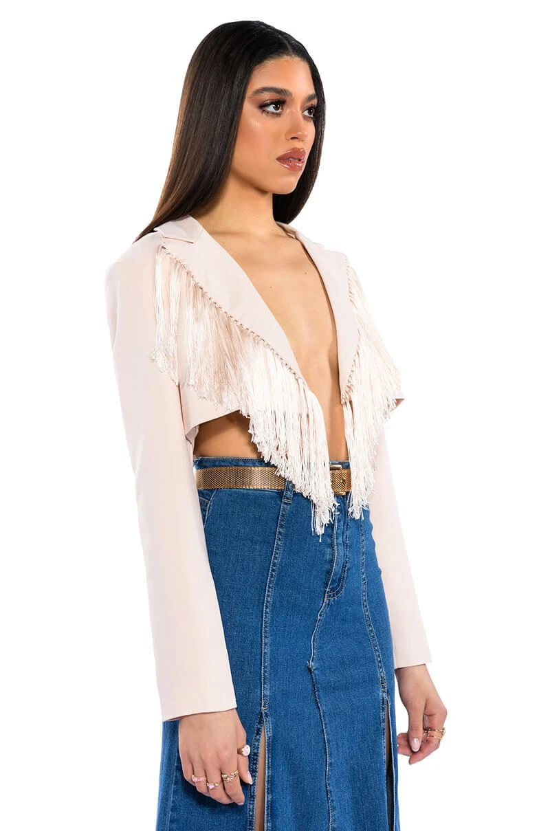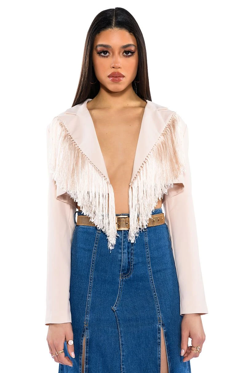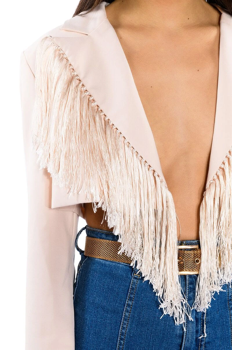 The AKIRA Label On The Fringe Crop Blazer is perfect for adding that extra edge to your look. Made with a chic, structured base fabrication, it features a notch lapel collar with cascading attached fringe detail, padded shoulders, long sleeves, and a cropped silhouette. Complete with a satin inner lining and a V-shaped pointed hemline. Slip this ultra cropped blazer over a bodysuit, high waisted denim, and heels for a finished look!