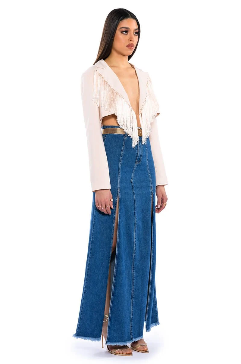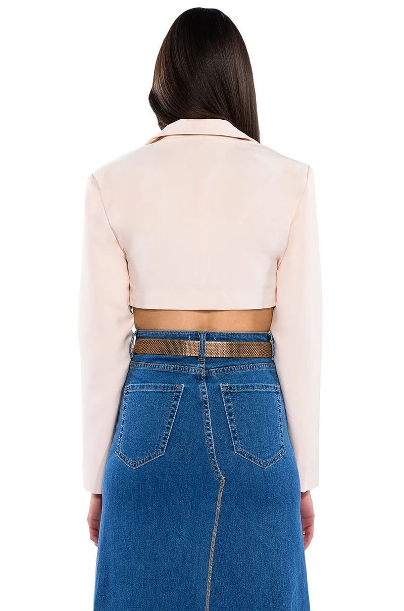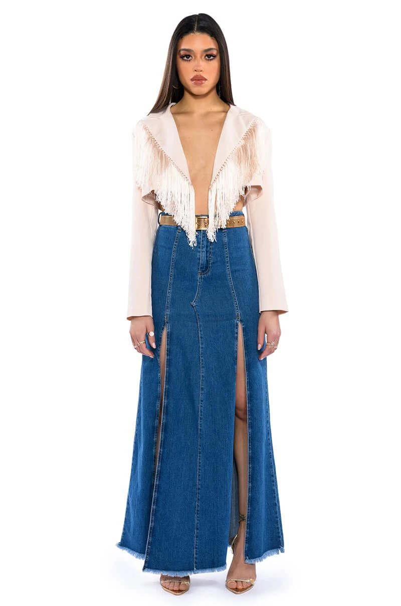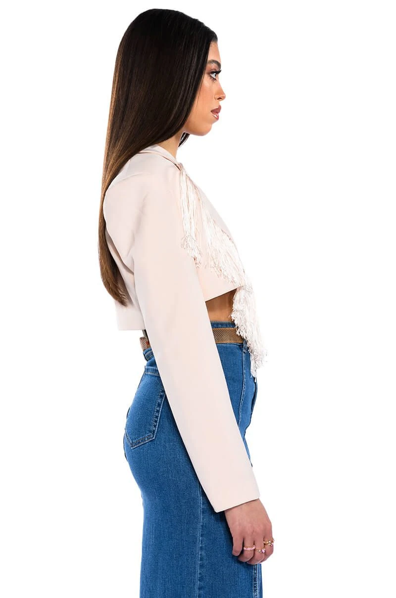 The AKIRA Label On The Fringe Crop Blazer is perfect for adding that extra edge to your look. Made with a chic, structured base fabrication, it features a notch lapel collar with cascading attached fringe detail, padded shoulders, long sleeves, and a cropped silhouette. Complete with a satin inner lining and a V-shaped pointed hemline. Slip this ultra cropped blazer over a bodysuit, high waisted denim, and heels for a finished look!