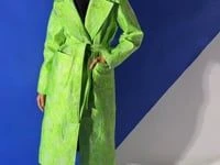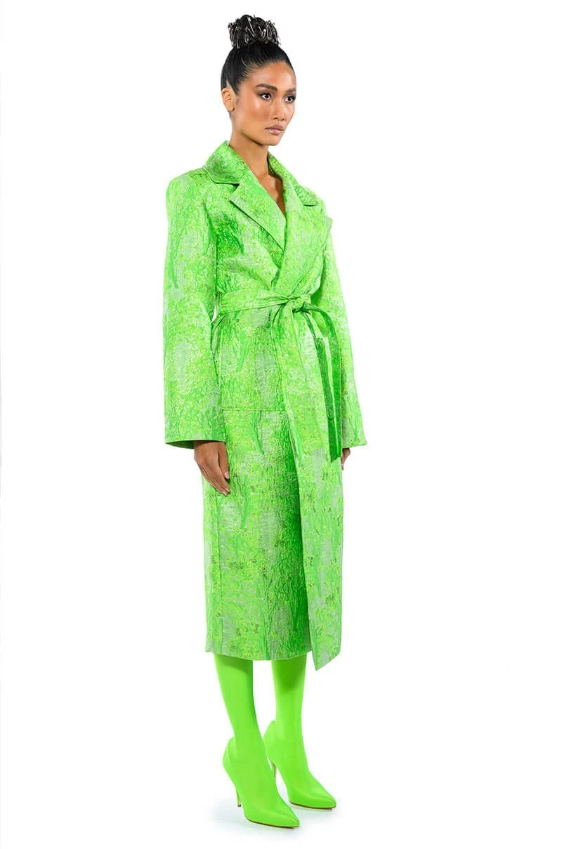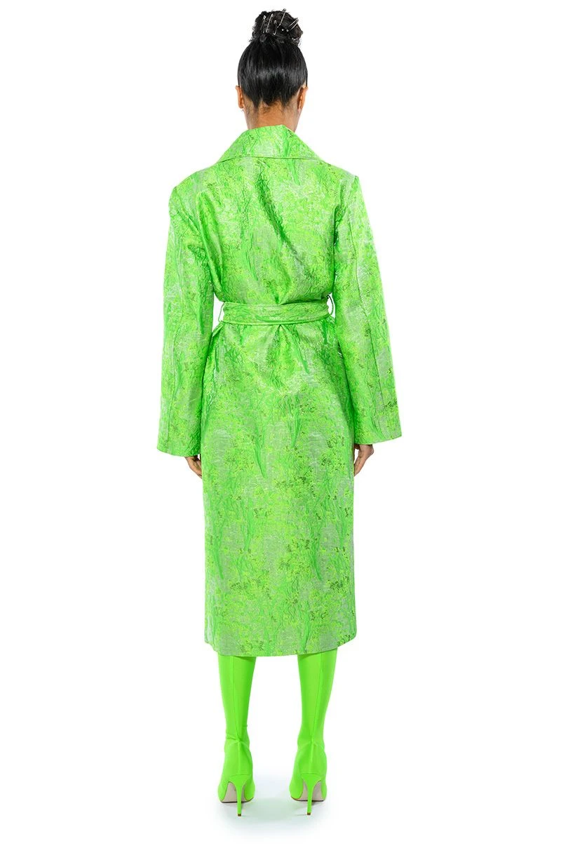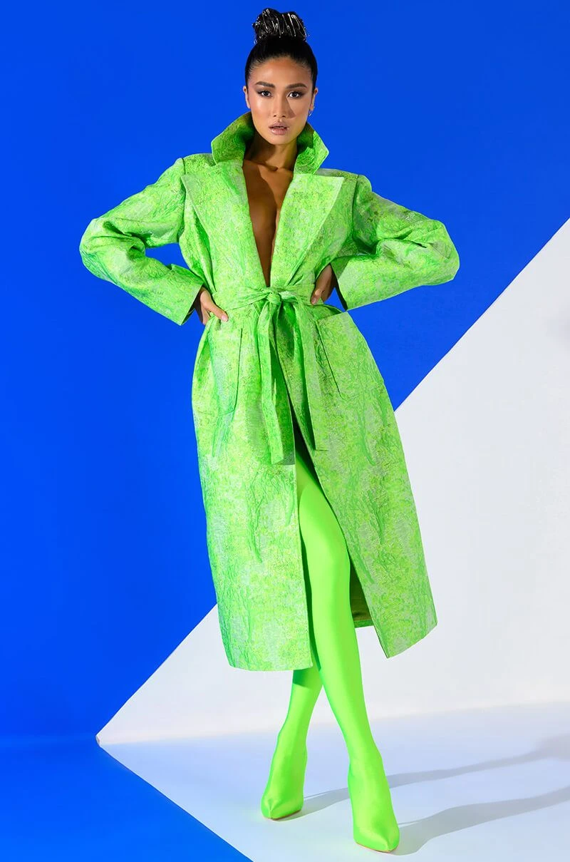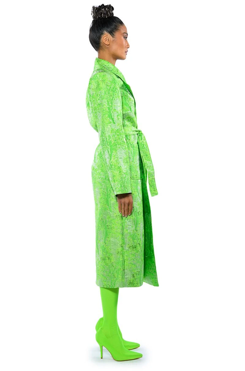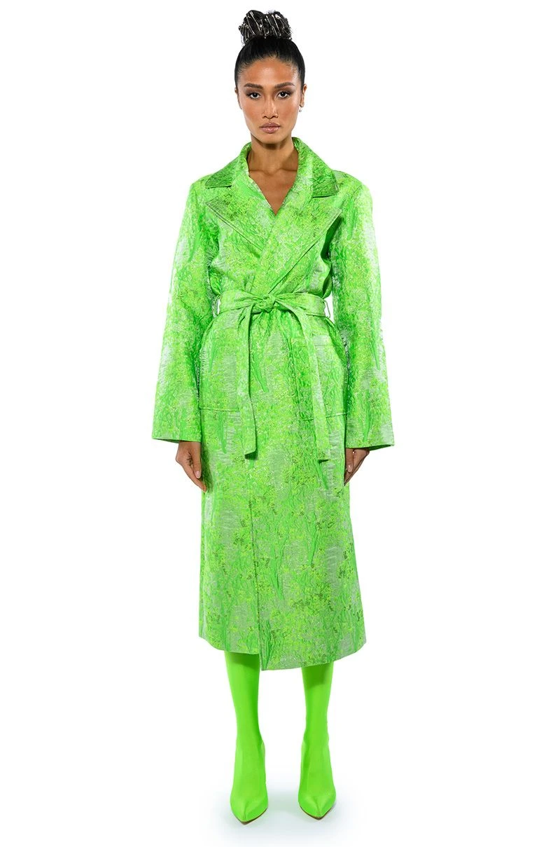 The AZALEA WANG Paris Fashion Week Tapestry Trench Coat is made from a glittery, embossed tapestry fabrication and features a notch collar, padded shoulders, long sleeves, patch pockets, a longline silhouette, satiny lining, and an open front. Complete with a coordinating tie waist closure.