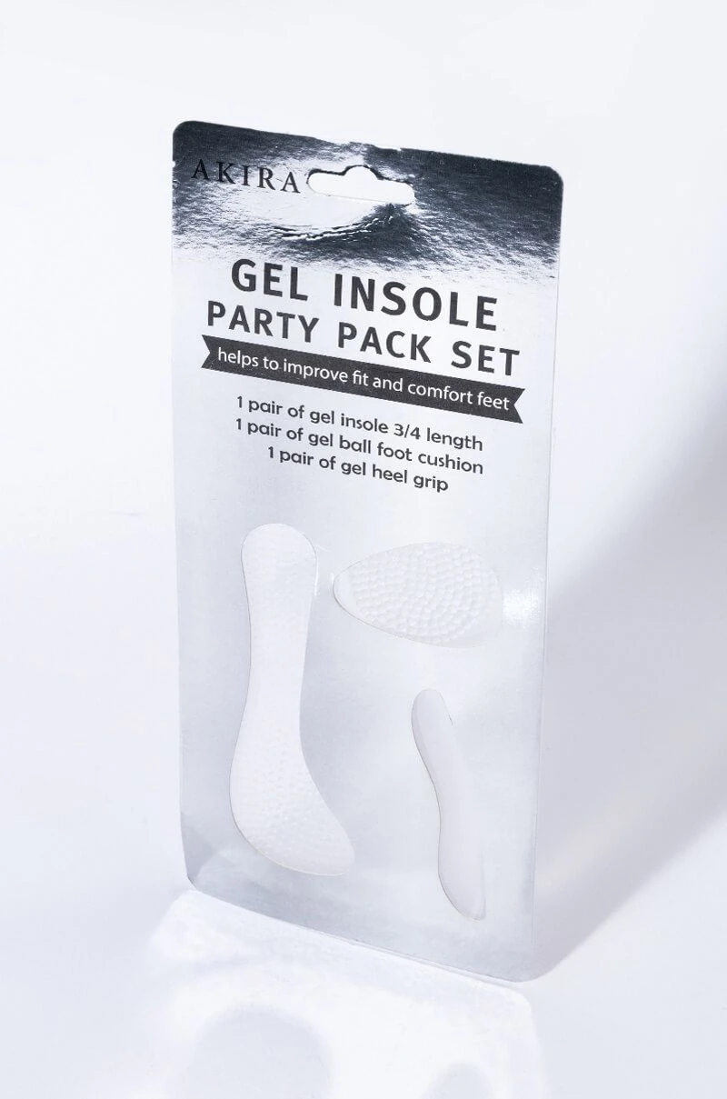 Party season needs party solutions. Prevent slipping and keep your feet cushioned all night long with The AKIRA Label Party On Insole Set. This set features three pairs of clear gel pads: one ¾ length, one ball of foot cushion, and one heel grip. Apply adhesive side down to inside-heel or forefront of shoe as appropriate, and dance the night away with ease.