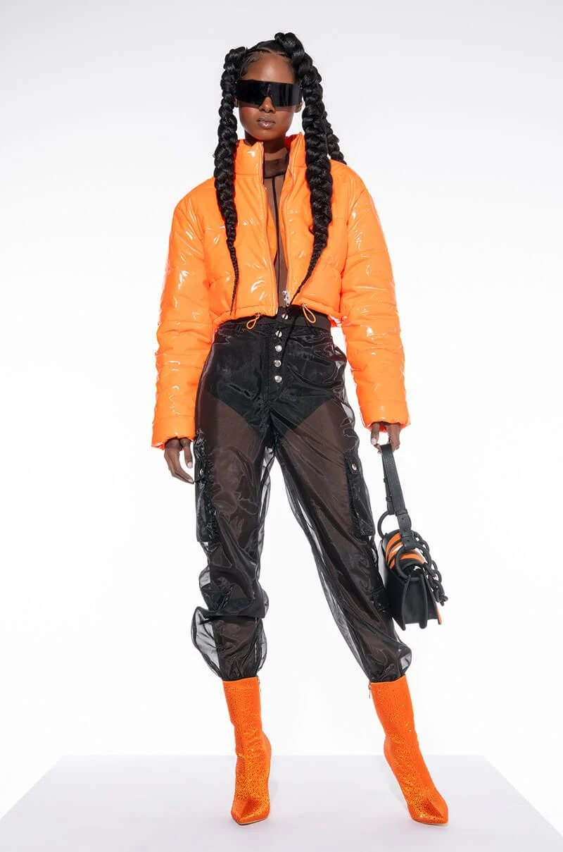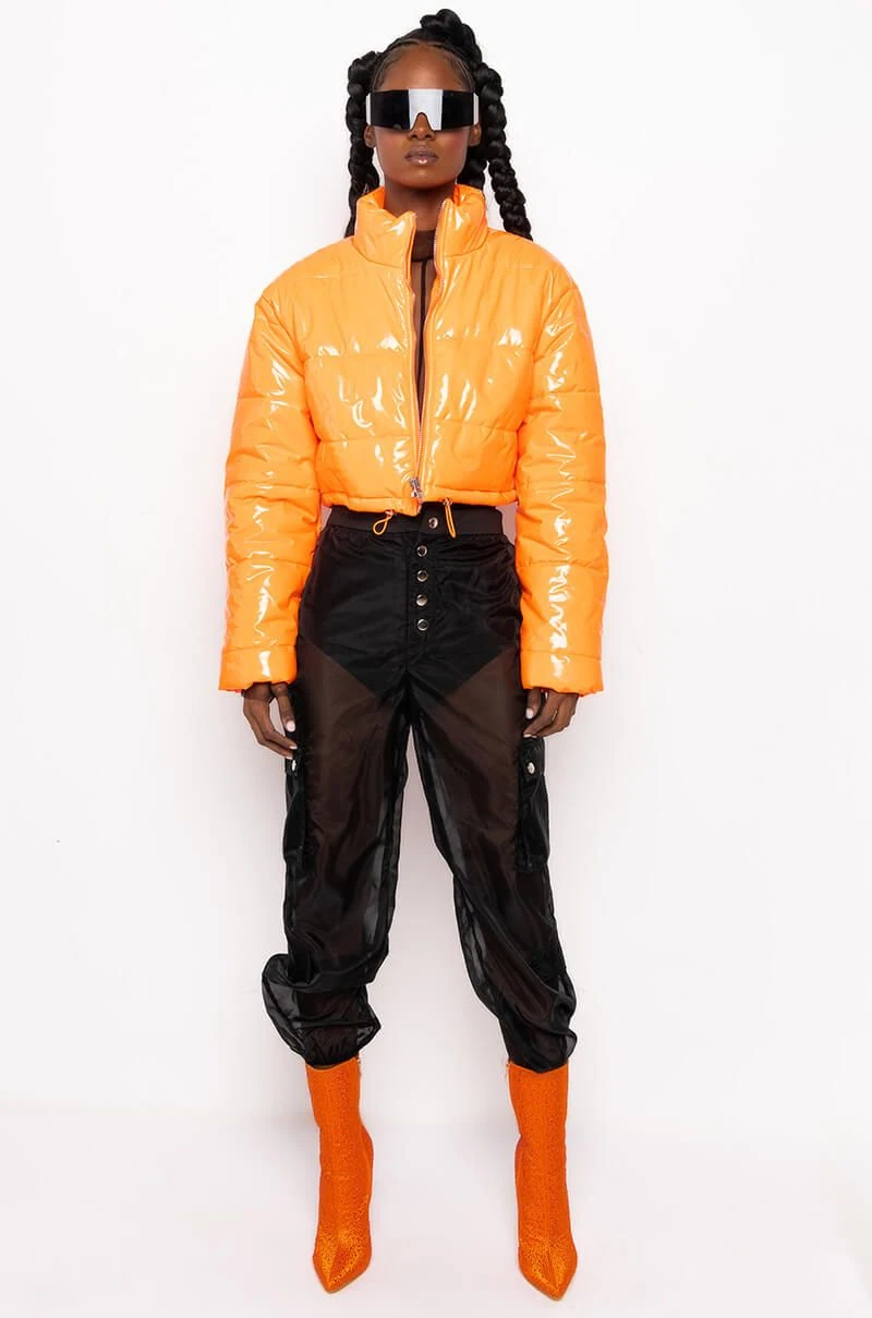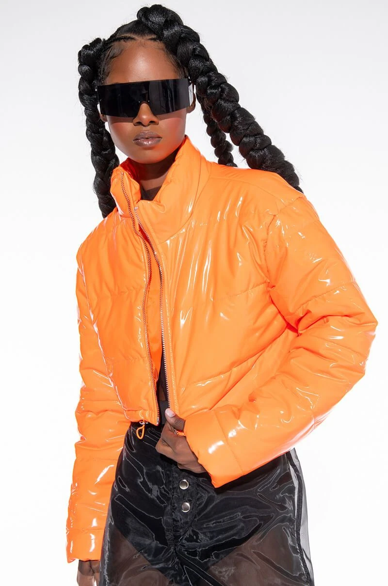 The AKIRA Label Patent Crop Puffer Jacket is made from a neon faux patent leather fabrication and is complete with a puffer body, long sleeves, a cropped length, a high neckline, a toggle drawstring waist, neon polyester lining, and a front zipper closure.