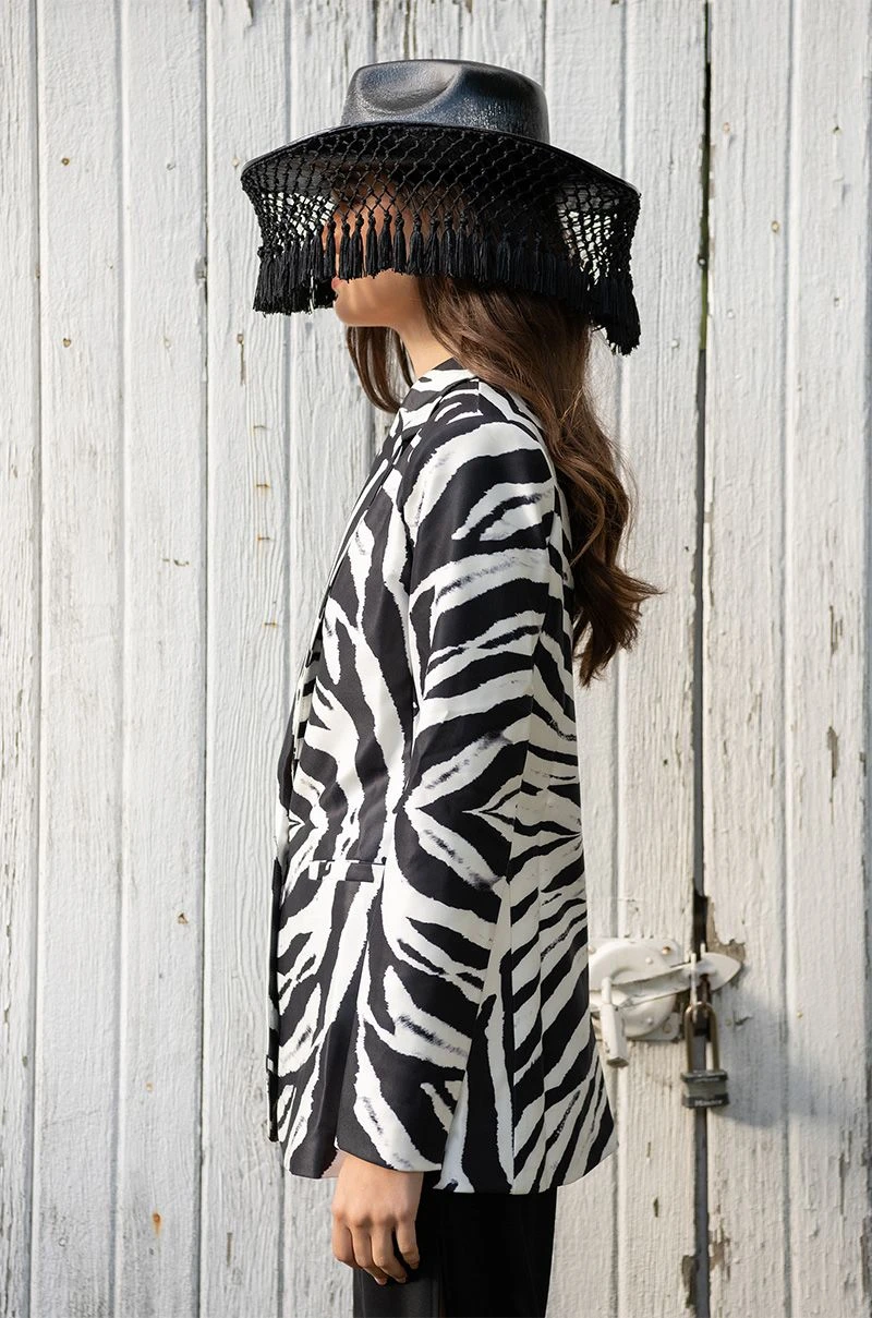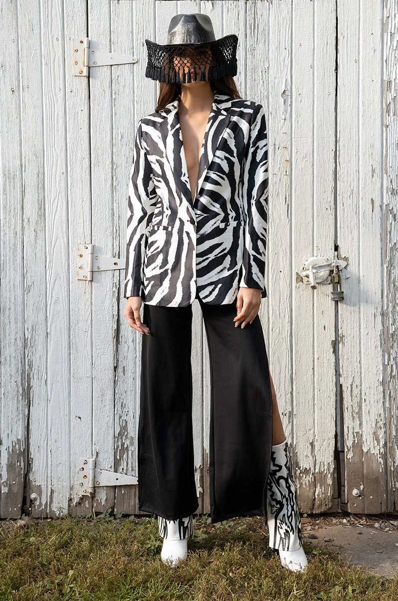 The AKIRA Label Prints Please Oversized Zebra Blazer features a structured yet smooth blazer fabrication, a zebra print design, a notched lapel collar, padded shoulders, and a longline silhouette. Complete with long sleeves, faux front pockets, a satin inner lining, and a single front button closure. Pair with wide leg trousers and a crop top for your next night out!