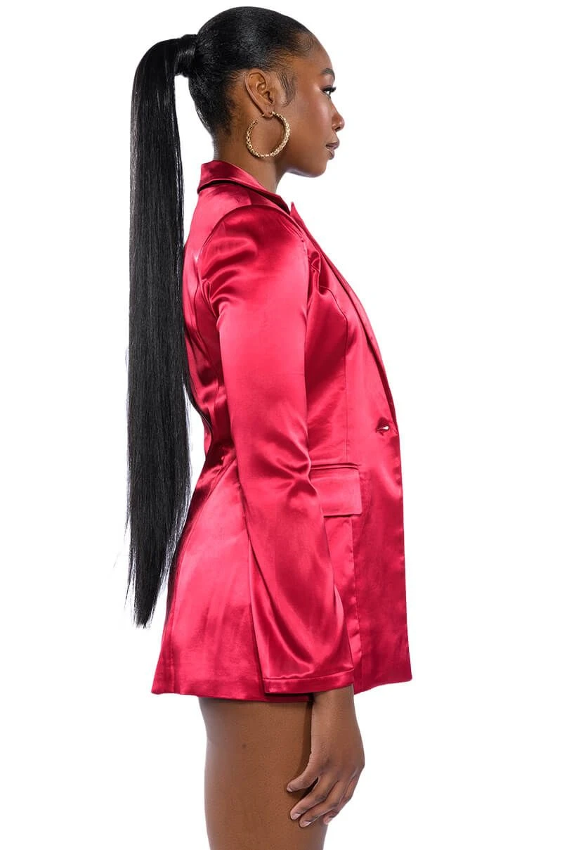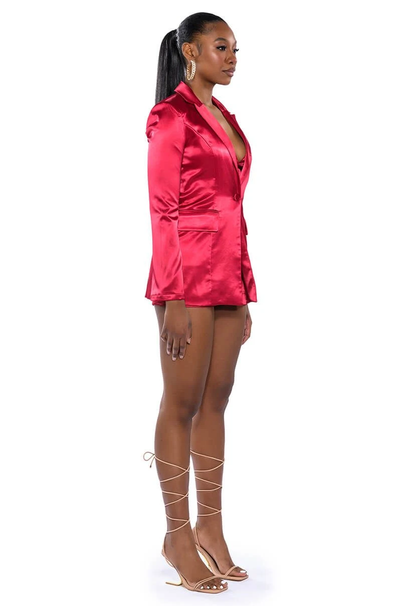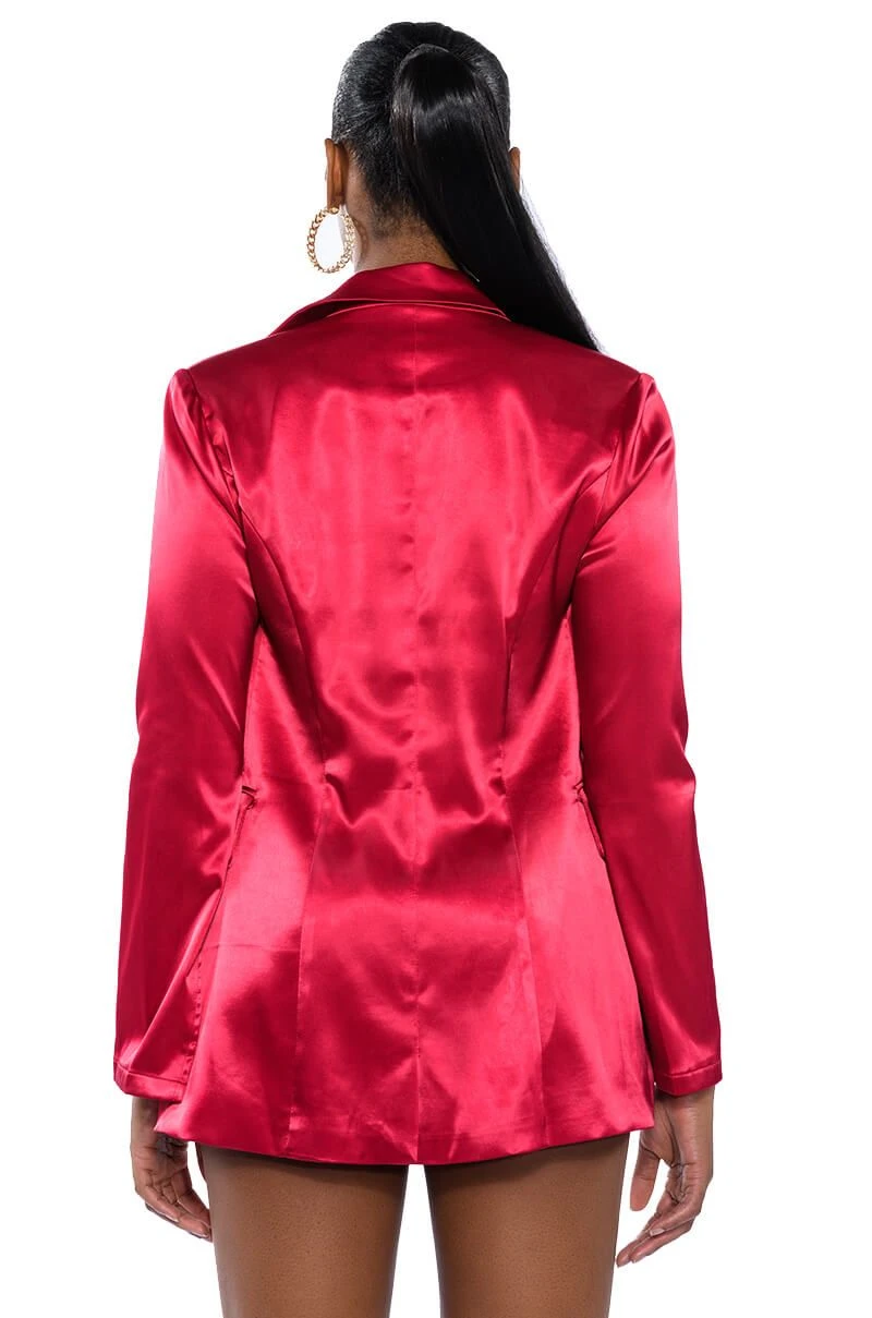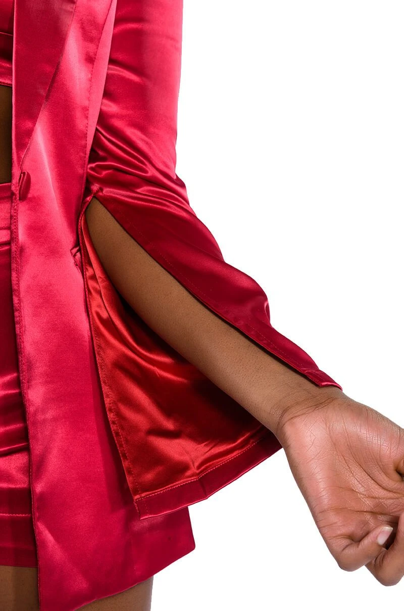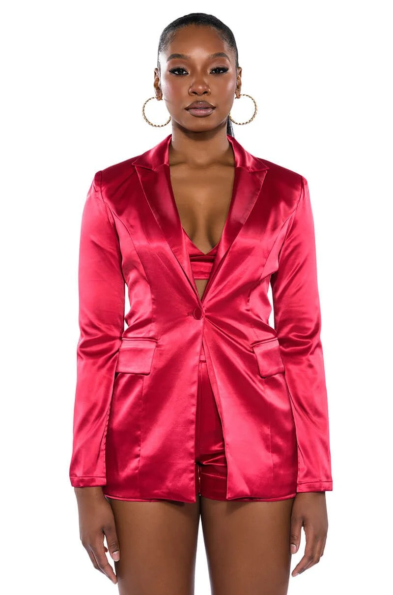 The AKIRA Label Spring Satin Blazer With Open Arm is a fitted, luxe piece featuring a satin base, a notch lapel collar, lightly padded shoulders, and princess seaming. Complete with a vented back slit, faux front pockets, long sleeves with slits, and a buttoned front closure. This blazer is part of an elegant 3-piece set, pairing perfectly with the coordinating AKIRA Label Spring Satin Bralette and Spring Satin Short. Throw on some booties and you’re ready to go!