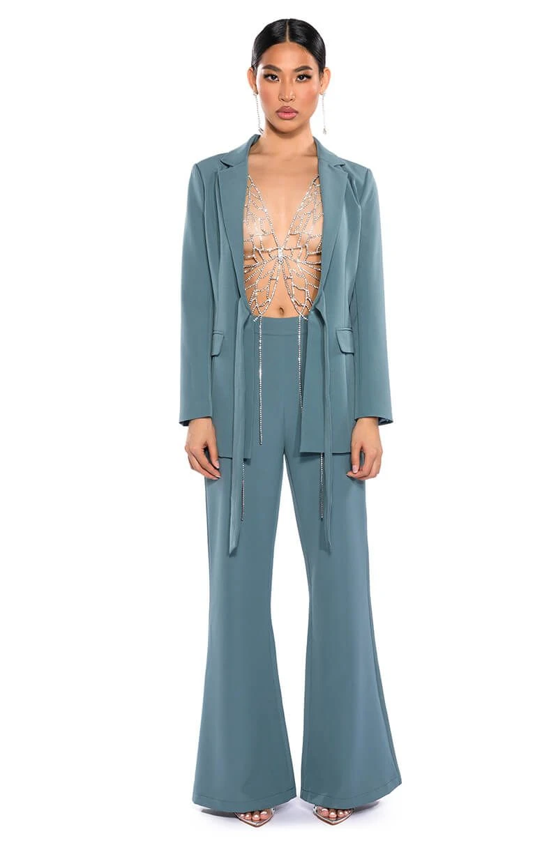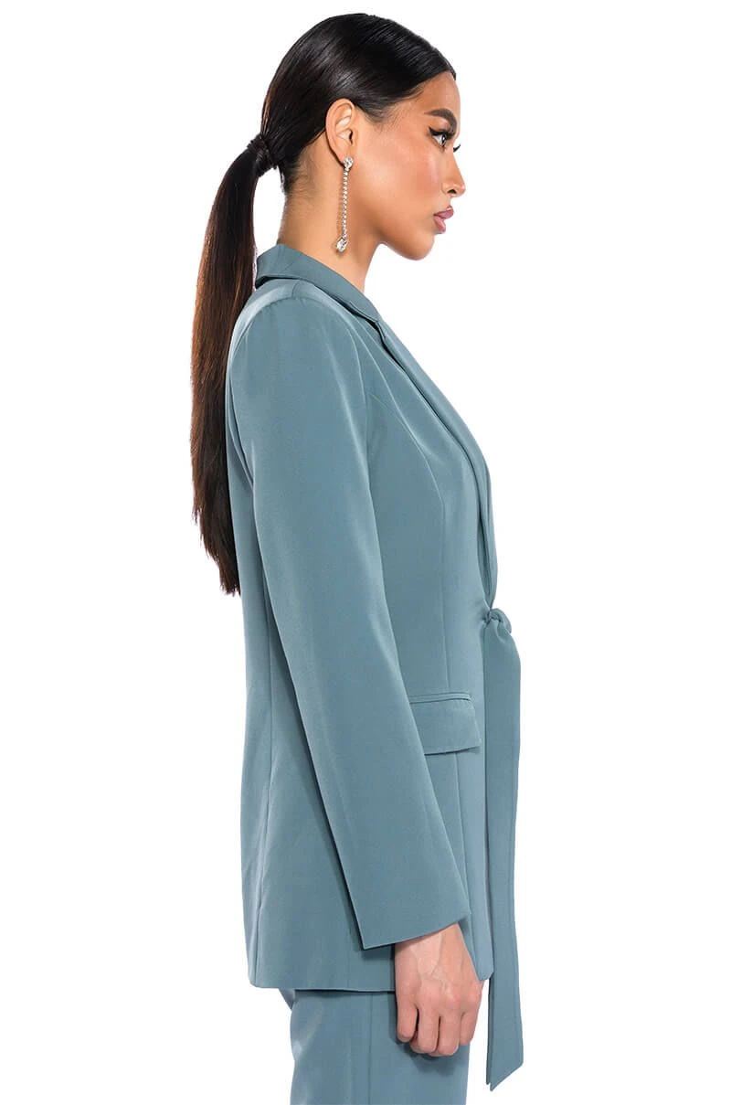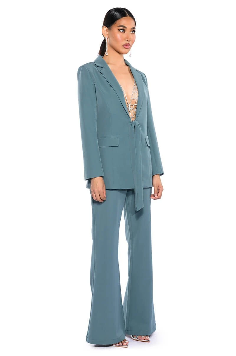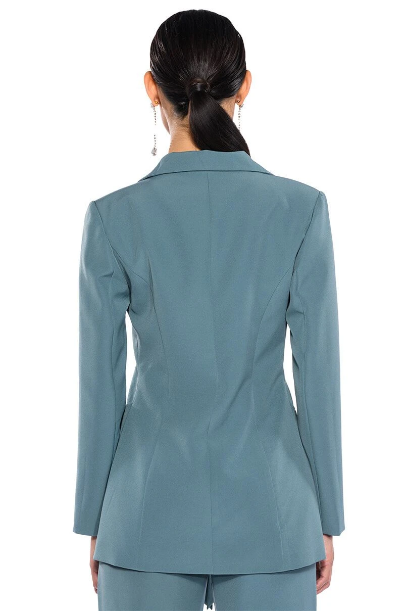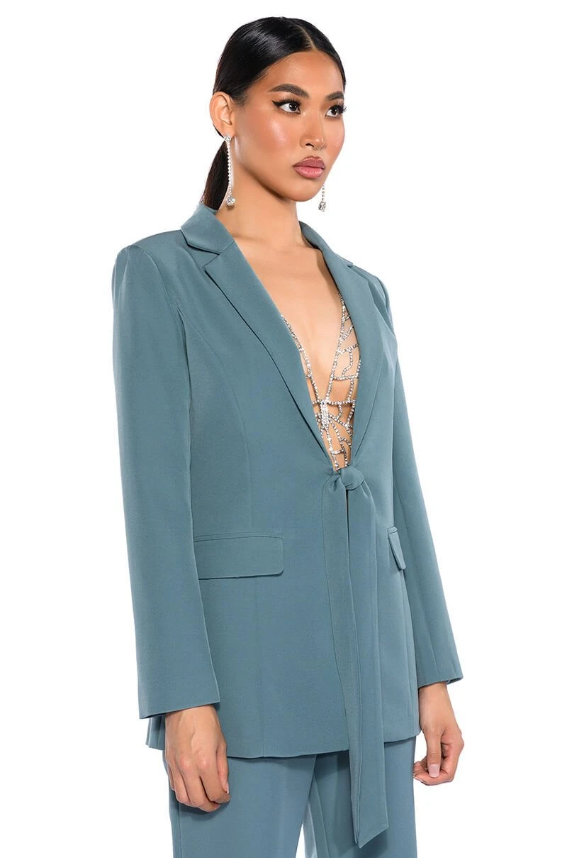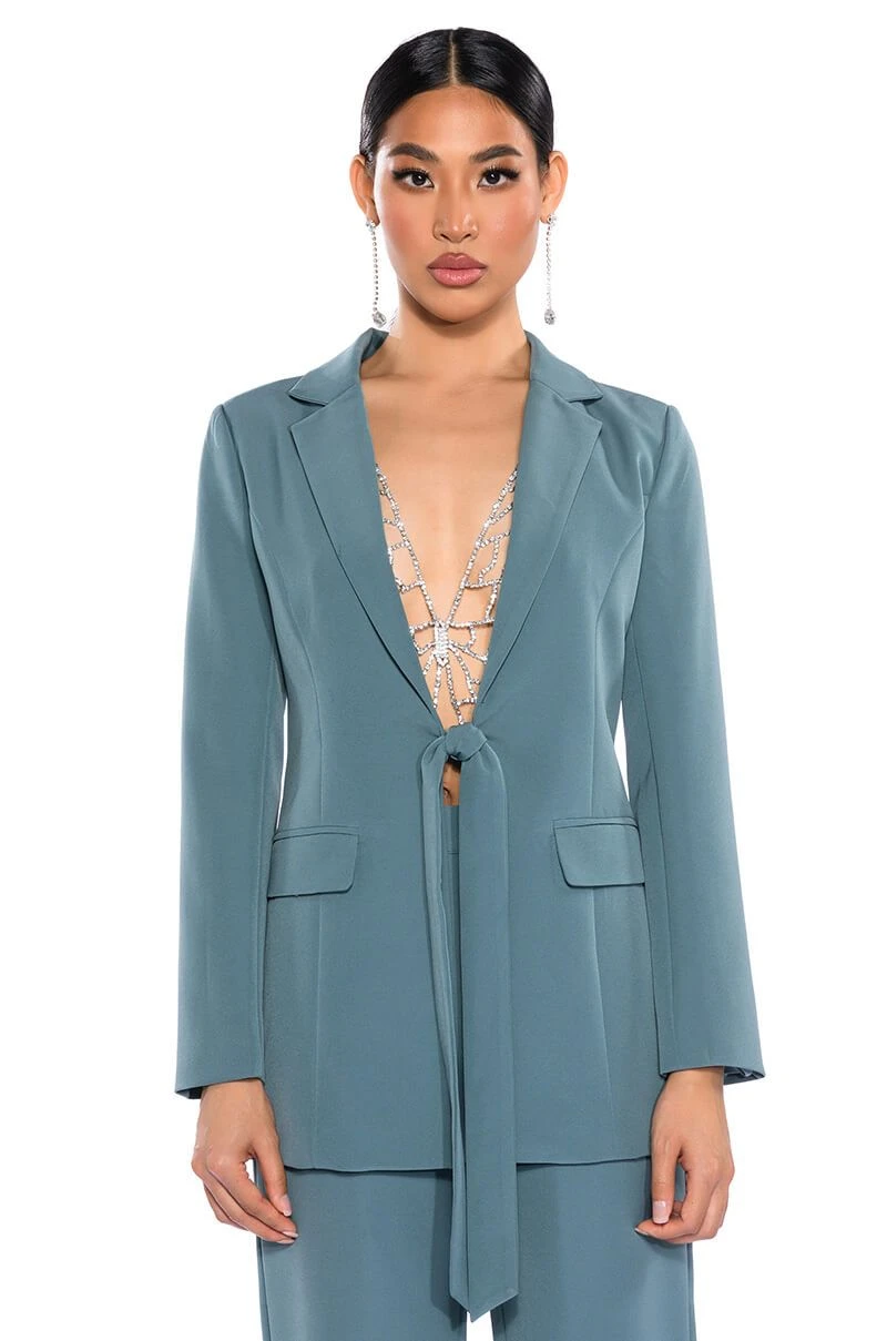 The AKIRA Label Star Rise Stretch Blazer is made from a sleek, lightweight base fabrication and features a notch lapel collar, princess seaming for a form-flattering design, lightly padded shoulders, and long sleeves. Complete with faux front pockets, wrap-around waist straps, and a smooth inner lining. Style with the matching bottoms, The AKIRA Label Star Rise Flare Pant, and platform heels.