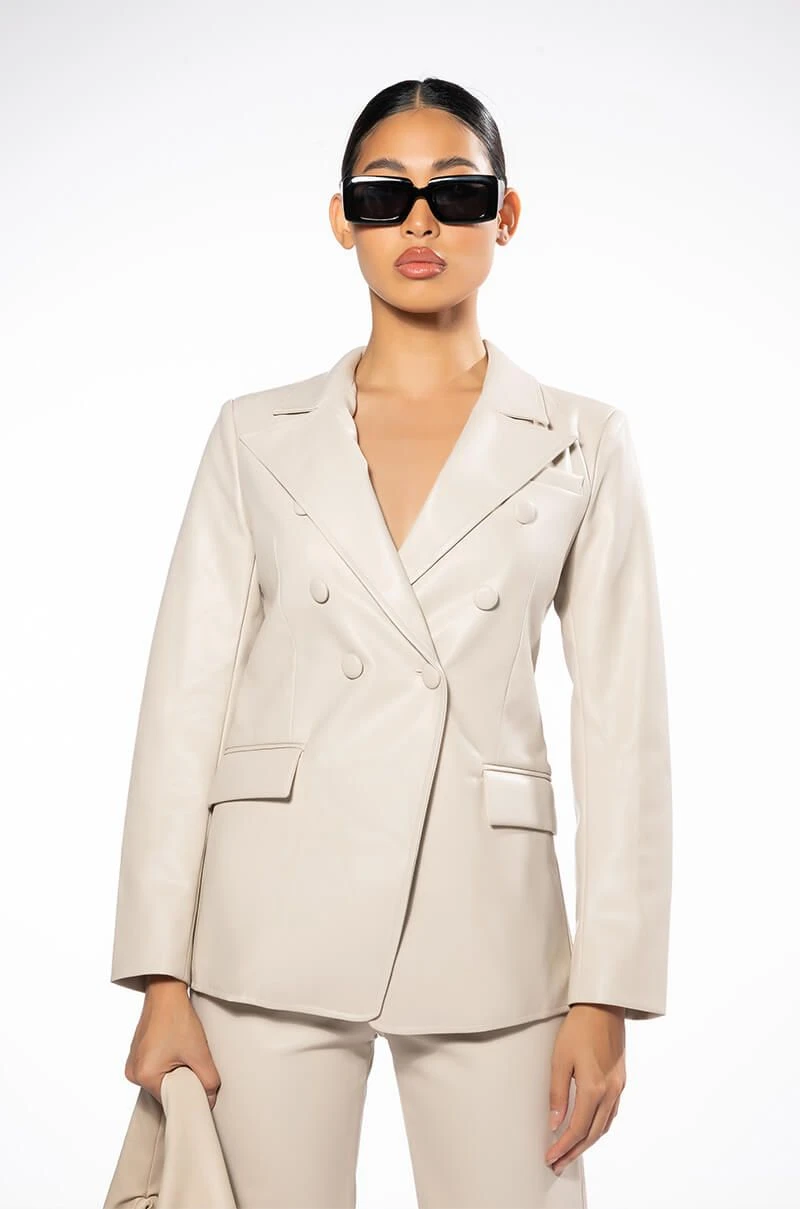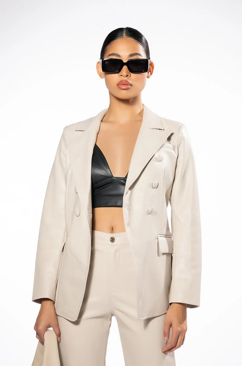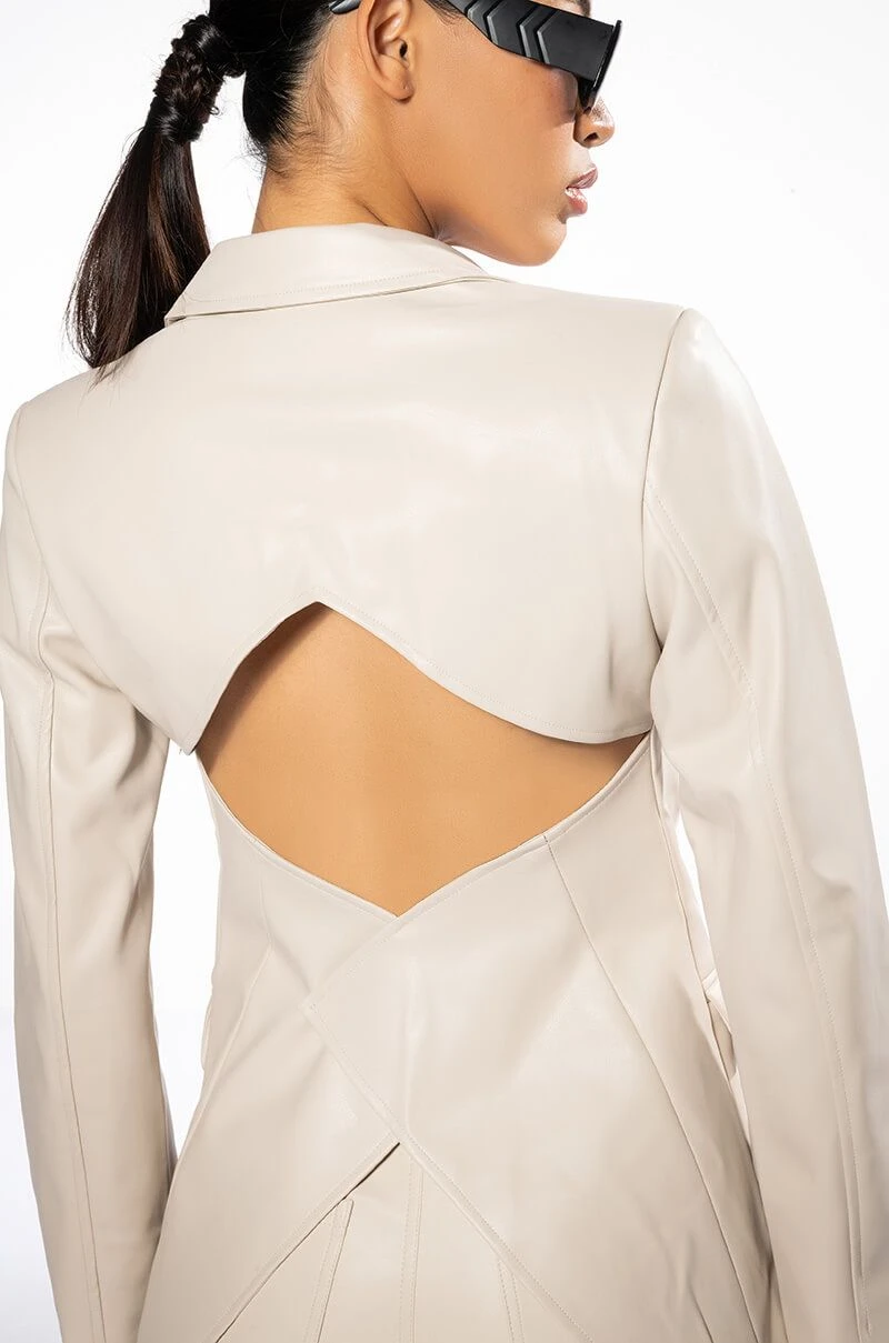 The AKIRA Label Te Quiero Vegan Leather Open Back Blazer is a faux leather blazer featuring a long sleeve silhouette, a single button front closure, a double-breasted silhouette, a notched fold over collar, and flap front pockets. Complete with a satin inner lining and a diamond-shaped back cut out.