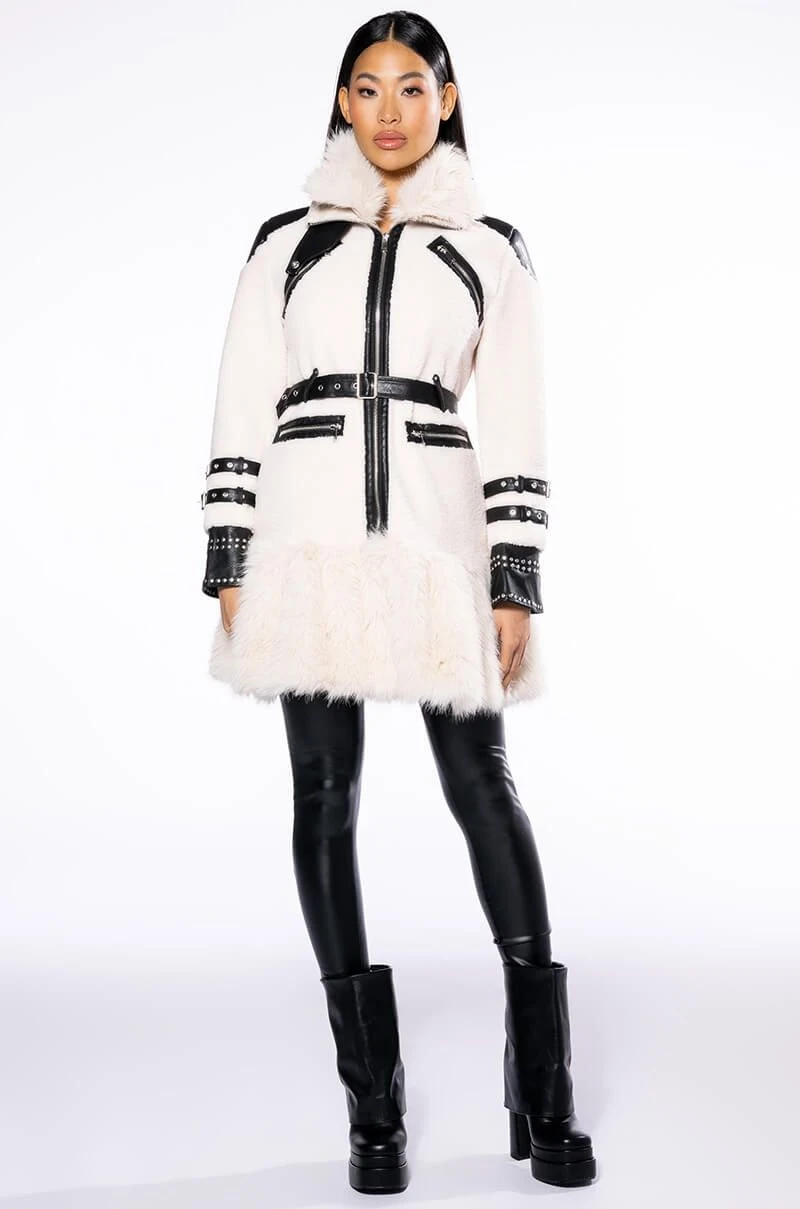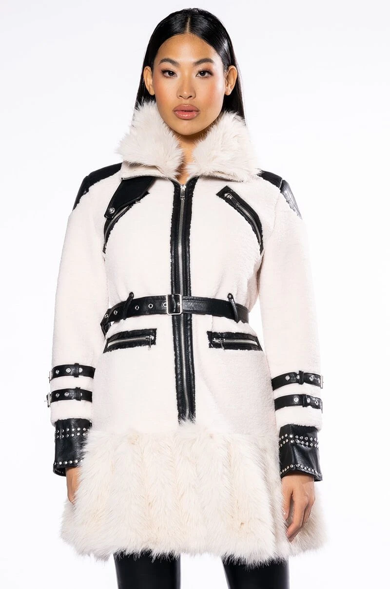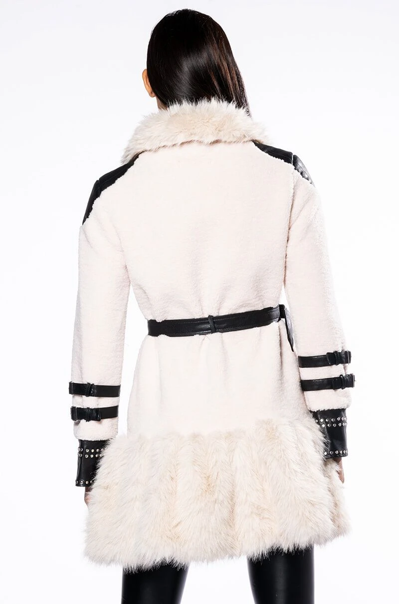 The AKIRA Label The Met Faux Fur Coat is a twist on your seasonal fave! This bold coat features a soft sherpa fabrication, faux leather trim detailing, chest pockets, side pockets, a detachable fur collar, belt loops, a faux leather tie waist belt, faux leather wrists with stud detailing, and a slightly longline silhouette with faux fur hem.